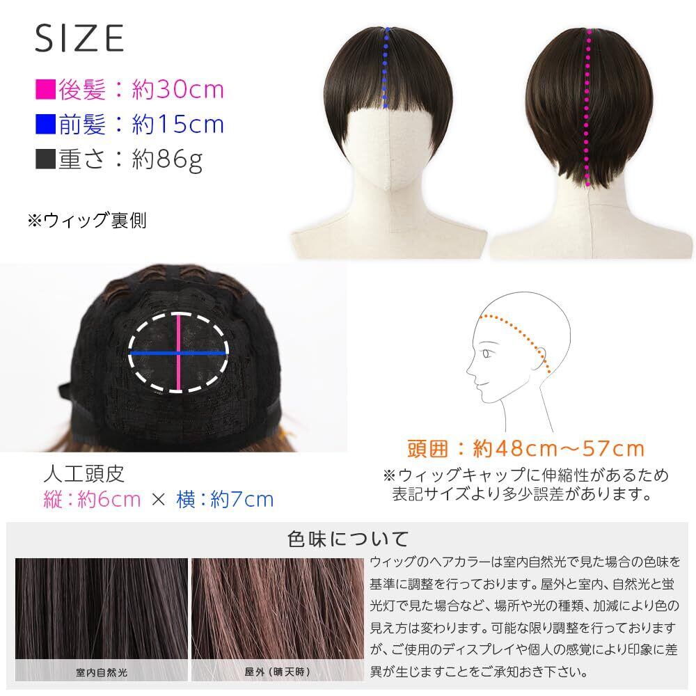 髪の長さ:後髪:約30cm 前髪:約15cm 重量:約86g サイズ:フリーサイズ(頭のサイズ約48cmから57cm)アジャスターでサイズ調整可能。※ウィッグに伸縮性がある為、表記サイズより多少誤差があります。