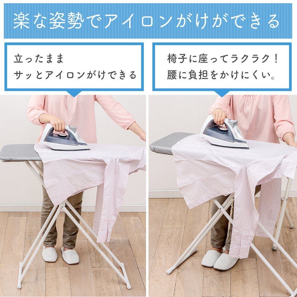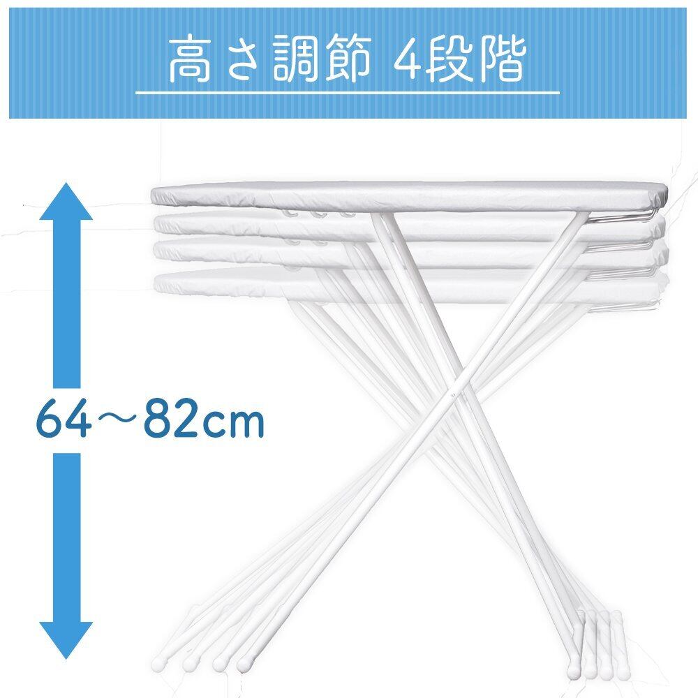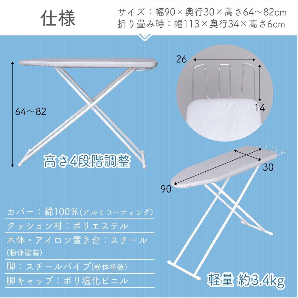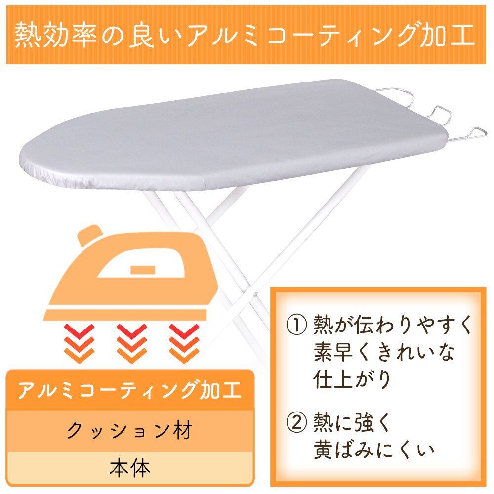 材質:カバー/綿100%(アルミコーティング)、クッション材/ポリエステル、本体・アイロン置き台/スチール(粉体塗装)、脚/スチールパイプ(粉体塗装)、脚キャップ/ポリ塩化ビニル
