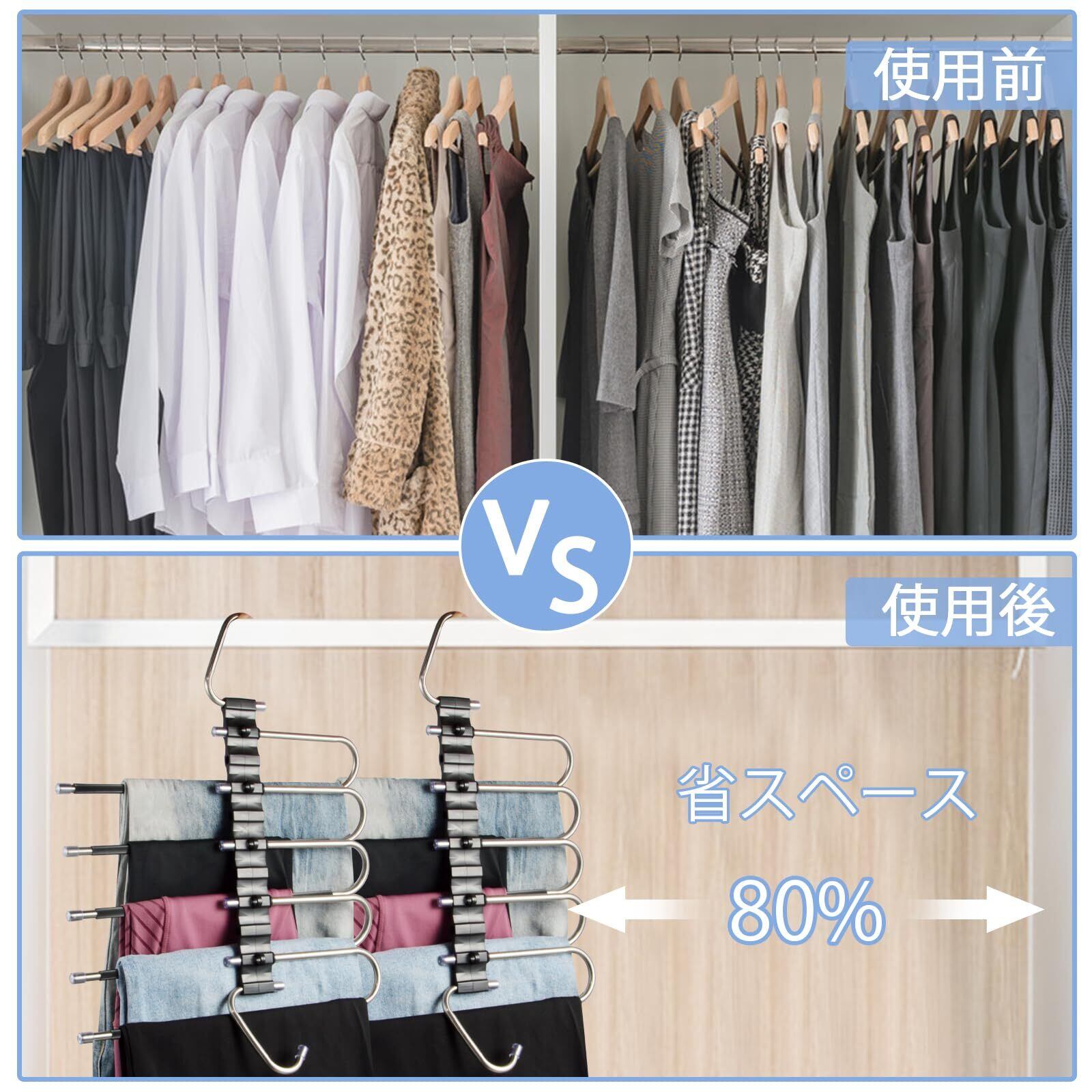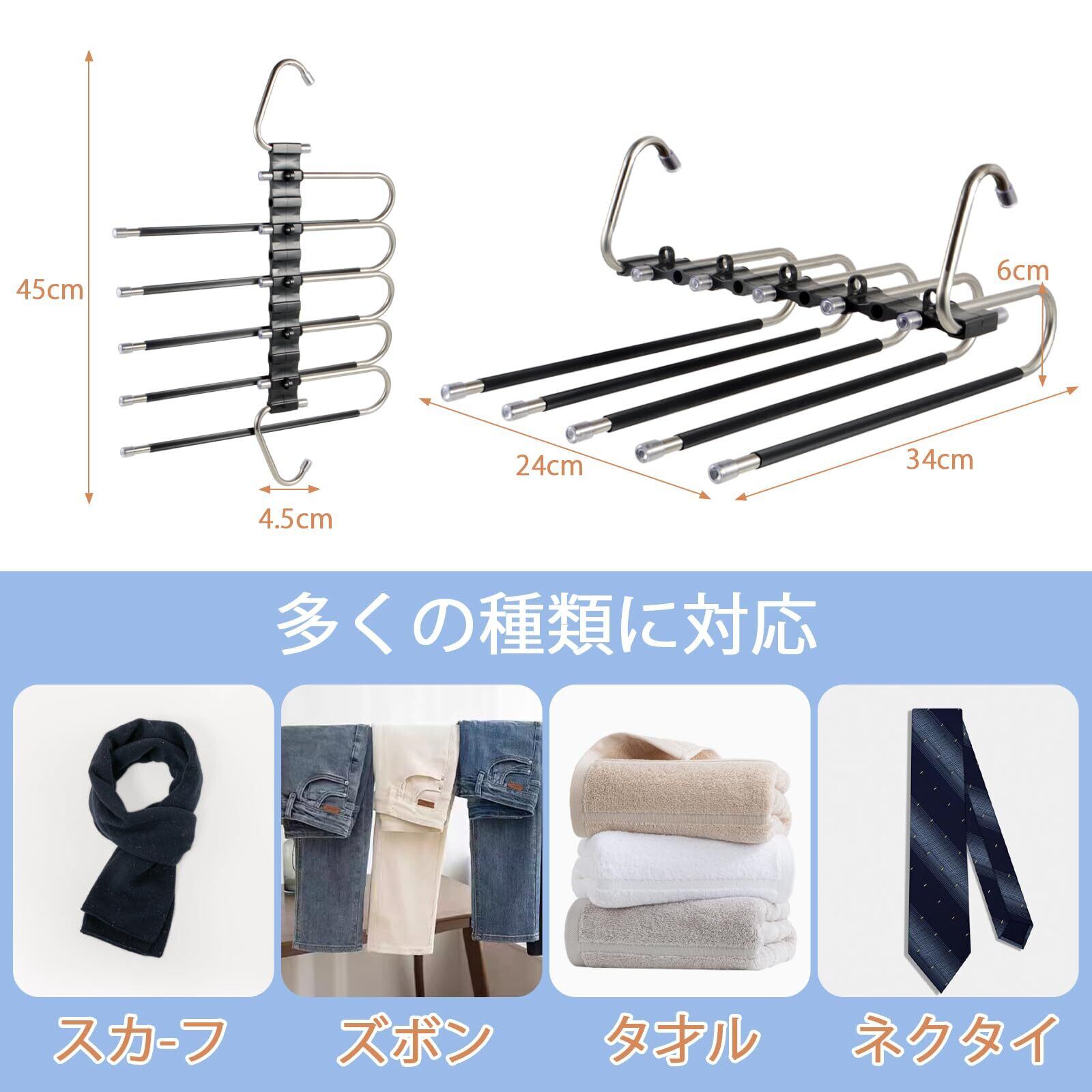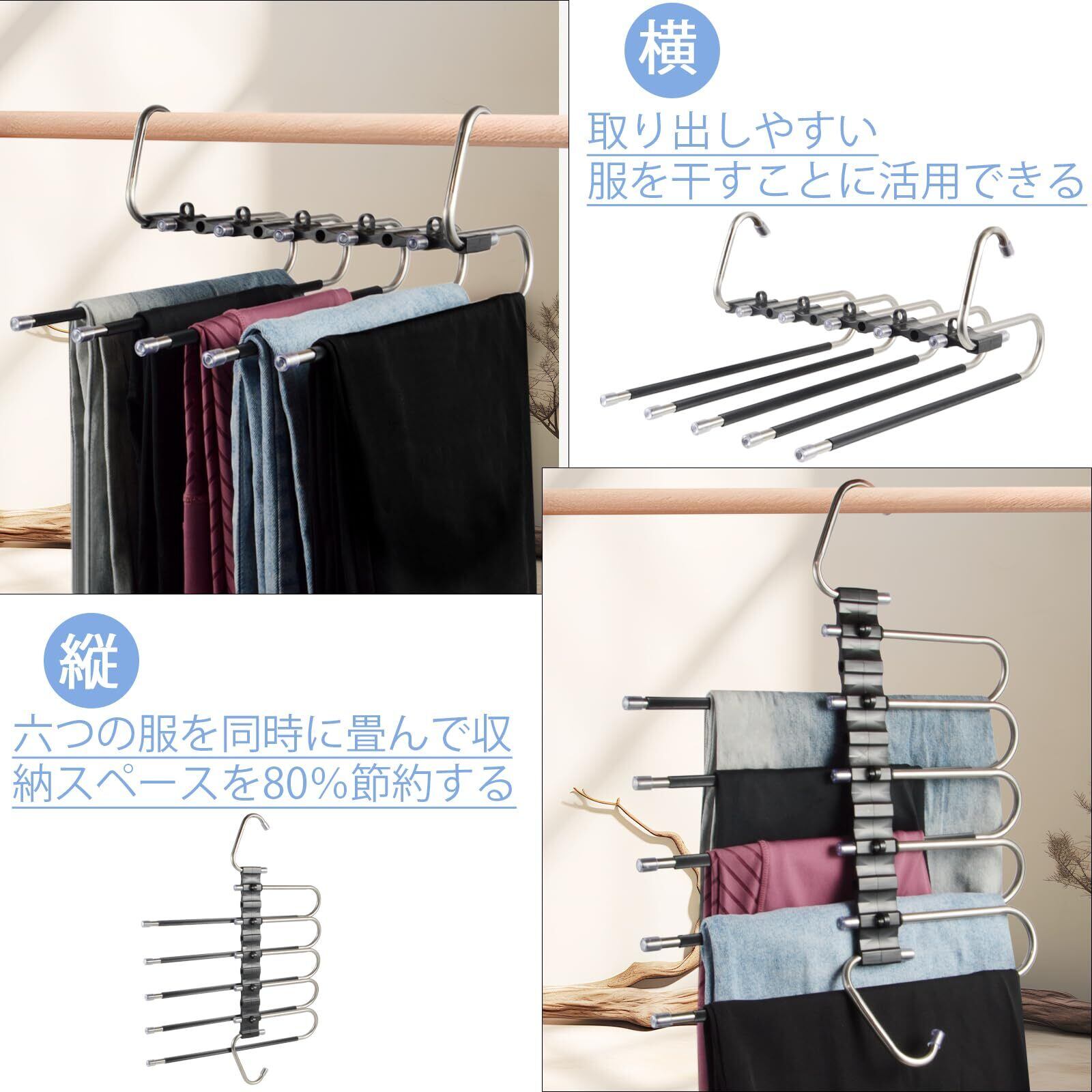 【省スペースズボンハンガー】このズボンハンガーは6連折り畳み式のデザインによって、空間を最大限に利用できて、ジーンズ、ズボンが同時に6つ収納可能となります。その他の衣類を収納できます。衣装室のスペースを最大限に節約し、清潔で整然とした状態を保ちます。強い耐荷重で形状が変わりにくく、長持ちします。