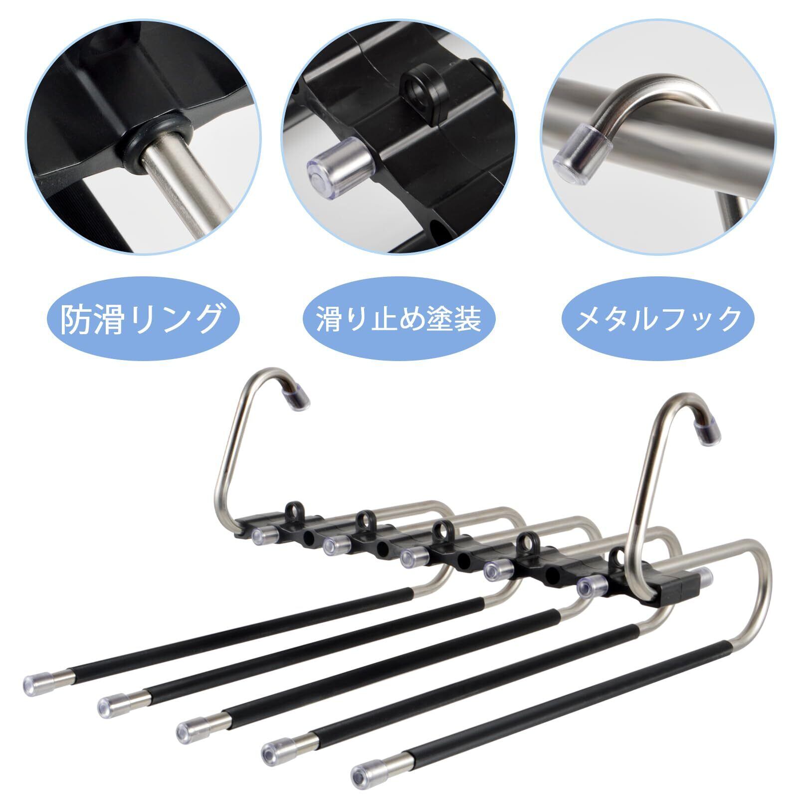 【滑り止めハンガー&上質な素材】高品質の防錆ステンレススチールと高品質のABSプラスチックで作られています。ハンガーが歪まず、安心して使用できます。スペースセービングパンツハンガーの最大耐荷重は6本のパンツに対応しています。掛けた服の落下を防ぐ6つの滑り止めのゴムカバー先端に付いており、安定性を高めて、ズボンをより安定に掛けられます。