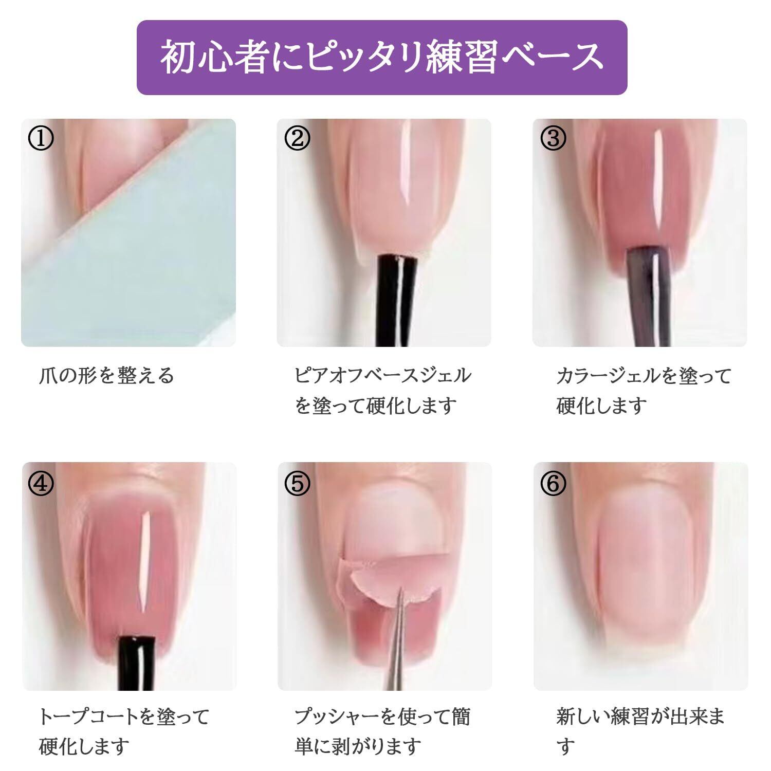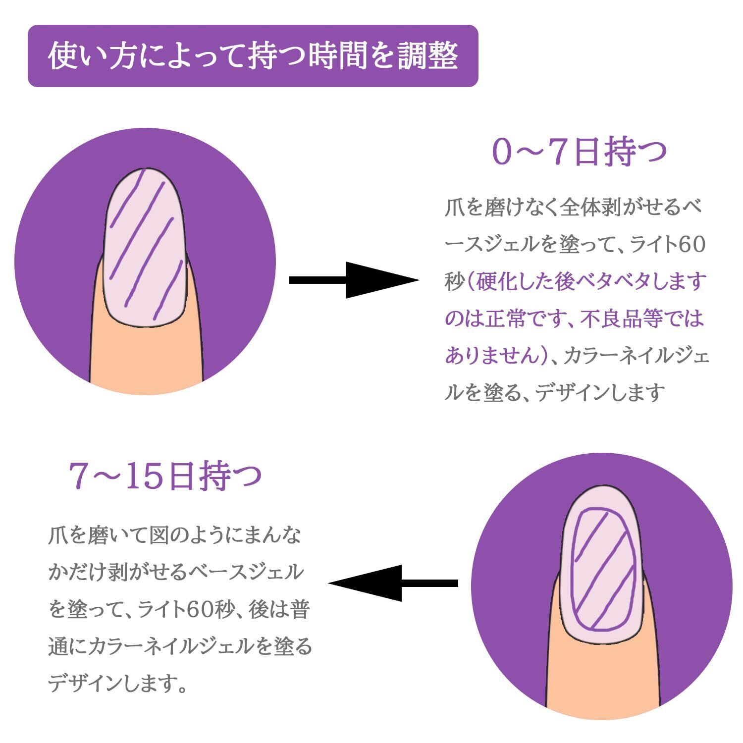 【ご注意】:ピアオフベースジェルを在UV / l LED灯でてらしてから、粘っこくなりまが、それが正常です。ネイルジェルとの接着がしやすくなるからです。それからをトップコート塗って、ネイルはサラサラになってきます。