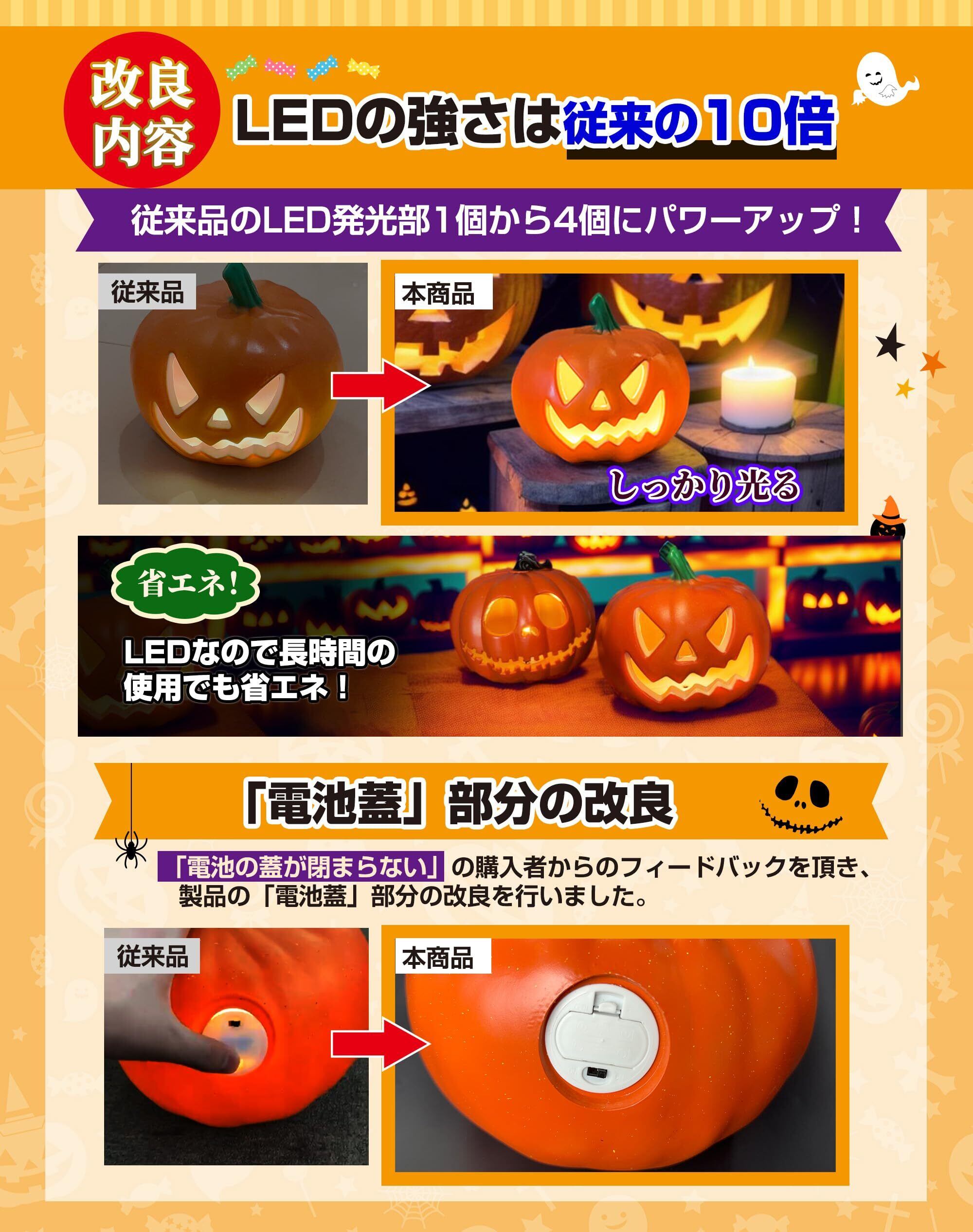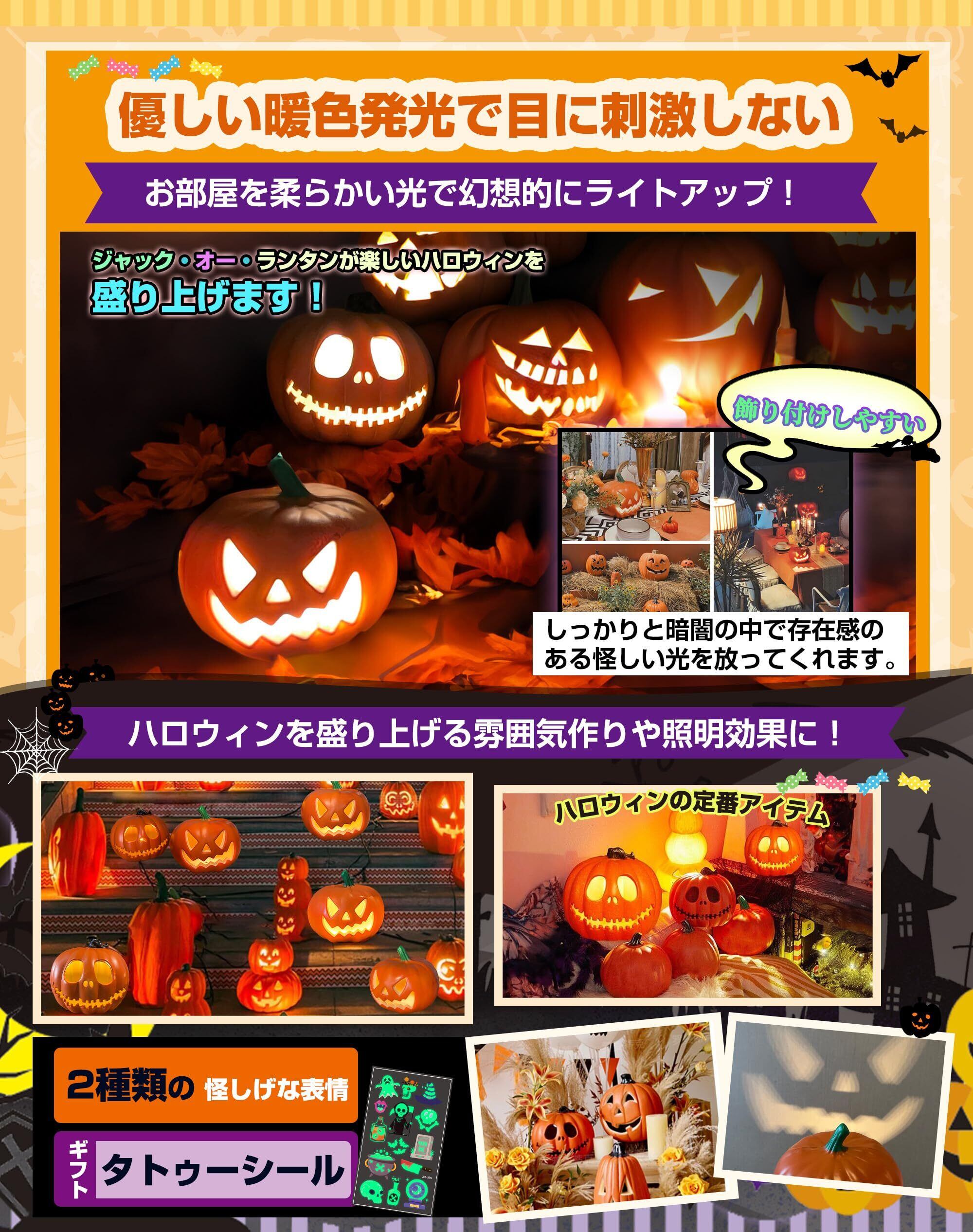 【大人気のパンプキンランタン】2023年最新発売!「電池の蓋が閉まらない」の購入者からのフィードバックを頂き、製品の「電池蓋」部分の改良を行いました。従来品のLED発光部1個から4個にパワーアップ!後ろのスイッチを入れると、中のLEDが光り、目と口が光り輝きます(常灯)。点灯時/消灯時それぞれひと味違う雰囲気を楽しむことができます。※中の電球の向きがイマイチだと眩しい、置く角度か電球向きの調整が必要。顔のデザインは2種類の怪しげな表情があります。パンプキンの大きさ23cm×22cm×21cmと大きいですので存在感があります。 ギフト:1枚のハロウィン専用蓄光タトゥーシールをワンセットでお届け致します。※ハロウィン蛍光タトゥーシールの色はランダムに配っていますが、ご理解ありがとうございます。