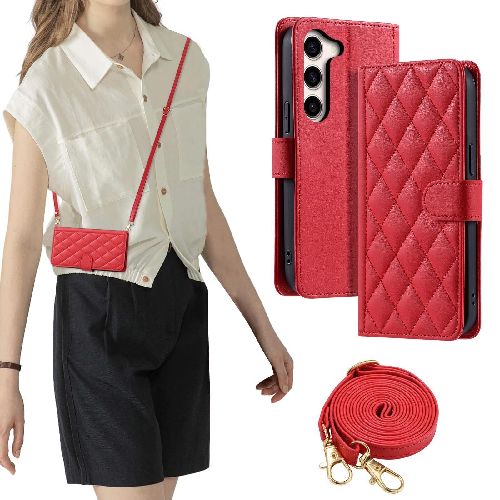 laddutoi FOR Galaxy S23 SC-51D SCG19 galaxy s23 ケース 手帳型 おしゃれ ストラップ付き スタンド機能 カード収納 軽量 薄型 耐衝撃 高級PUレザー 滑り防止 財布型 内蔵マグネット 開閉式 チェック柄 上質 耐摩擦 マグネット式 肩掛け 斜め掛けーレッド