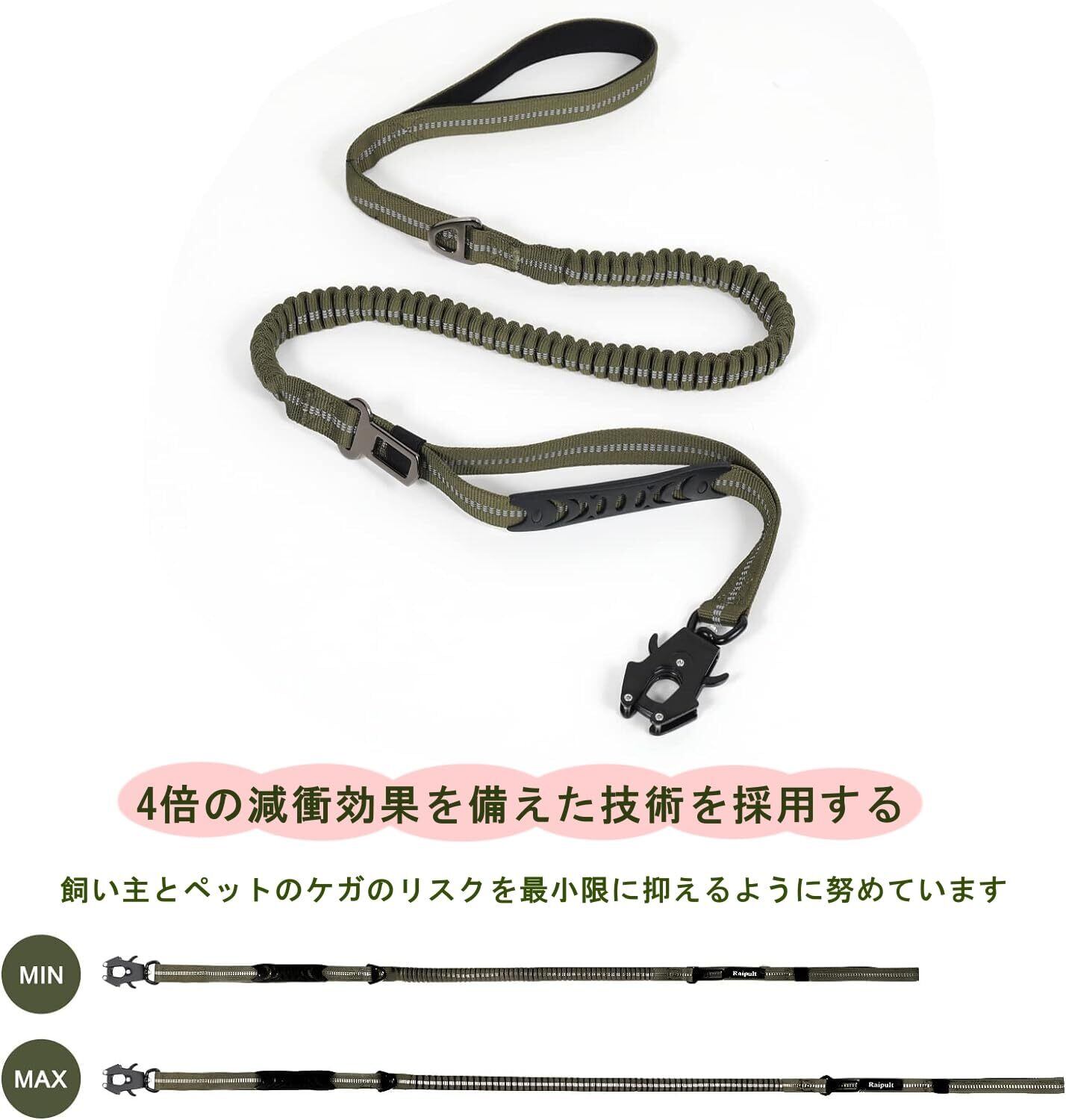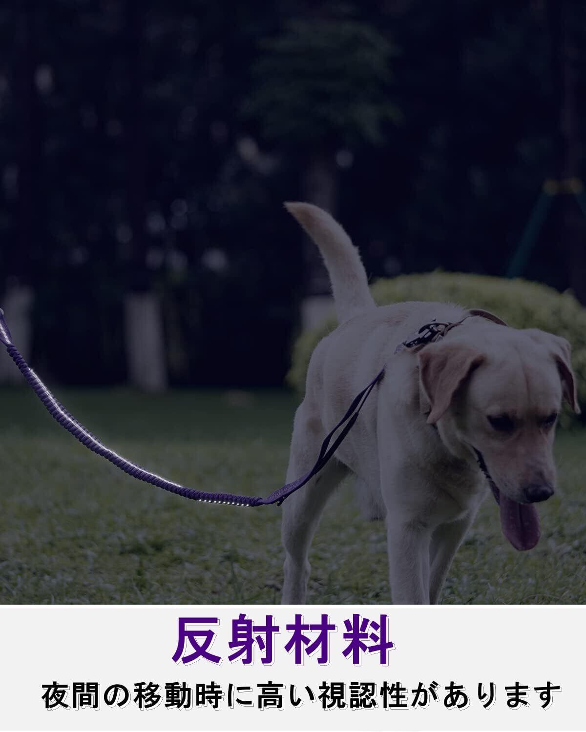 【多機能伸縮リード】大型犬リードには伸縮性あるゴムベルトで135ー190cmに伸縮し、愛犬に負担をかけません。シートベルトの上には反射リボンがついている、光に射されると反射の効果があります。夜でドライブするとより安全です。