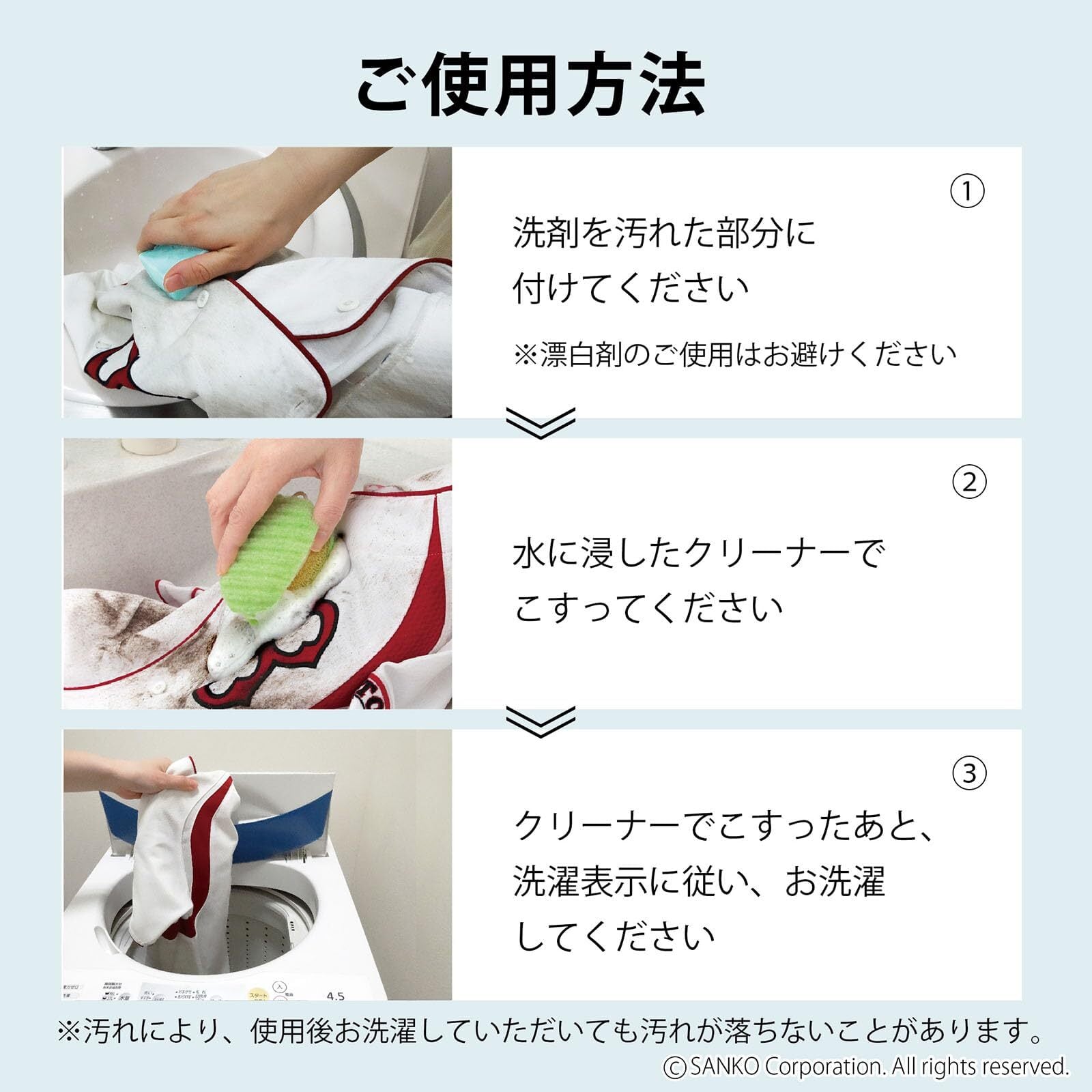 【使用方法】洗剤を落としたい汚れにつけた後、水に浸したブラシ(本品)でこすってください。その後、洗濯機の表示に従い洗濯してください。