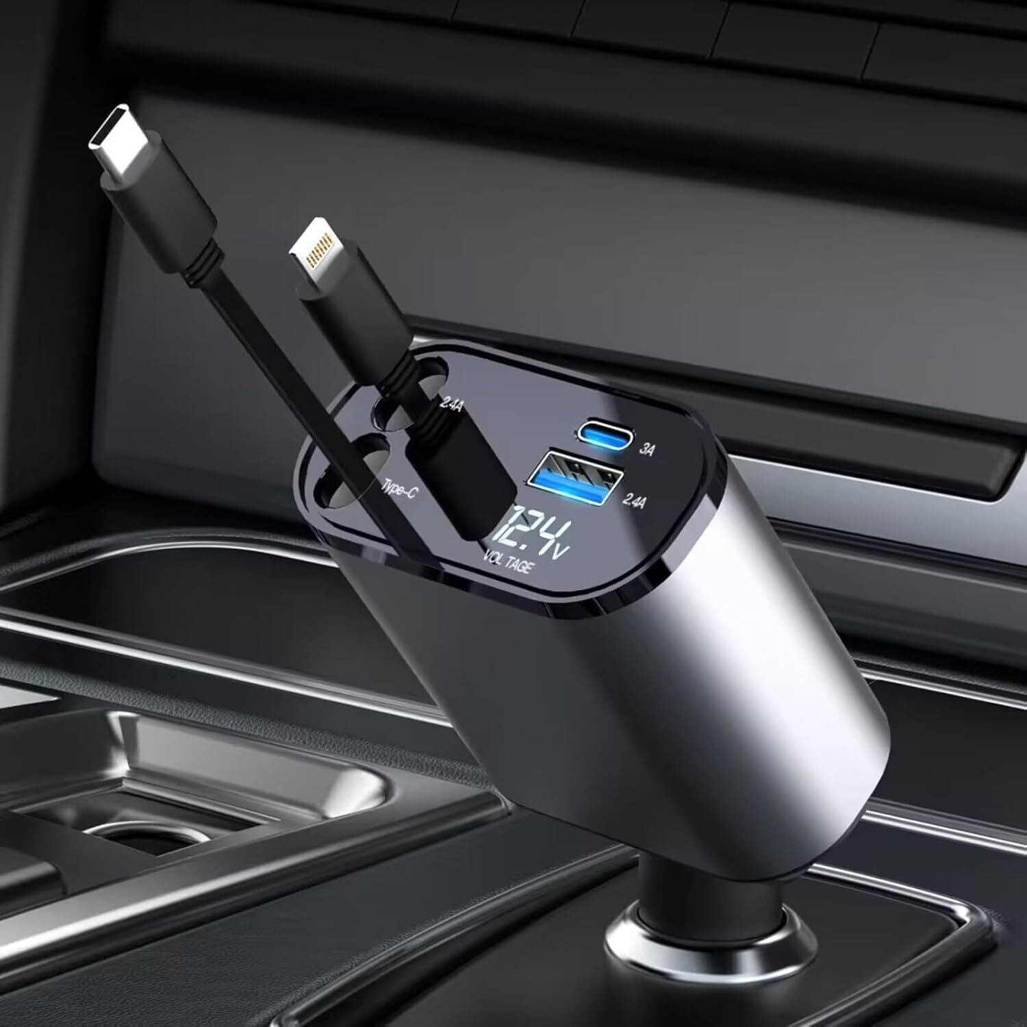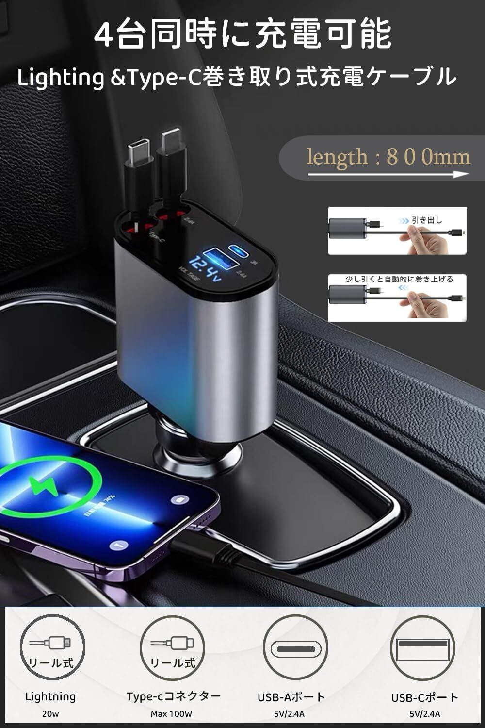 【巻き取り式】4in1 車 充電器 シガーソケット 4台同時充電 カーチャージャー 巻き取り式充電ケーブル 2本 Type-C100W/Lightning 20W急速充電 対応iPhone 16/15/14/13/12, Galaxy S22/S21 UItra, Xperia, iPad, AQUOSなど 電圧計を搭載 DC12/24V車対応