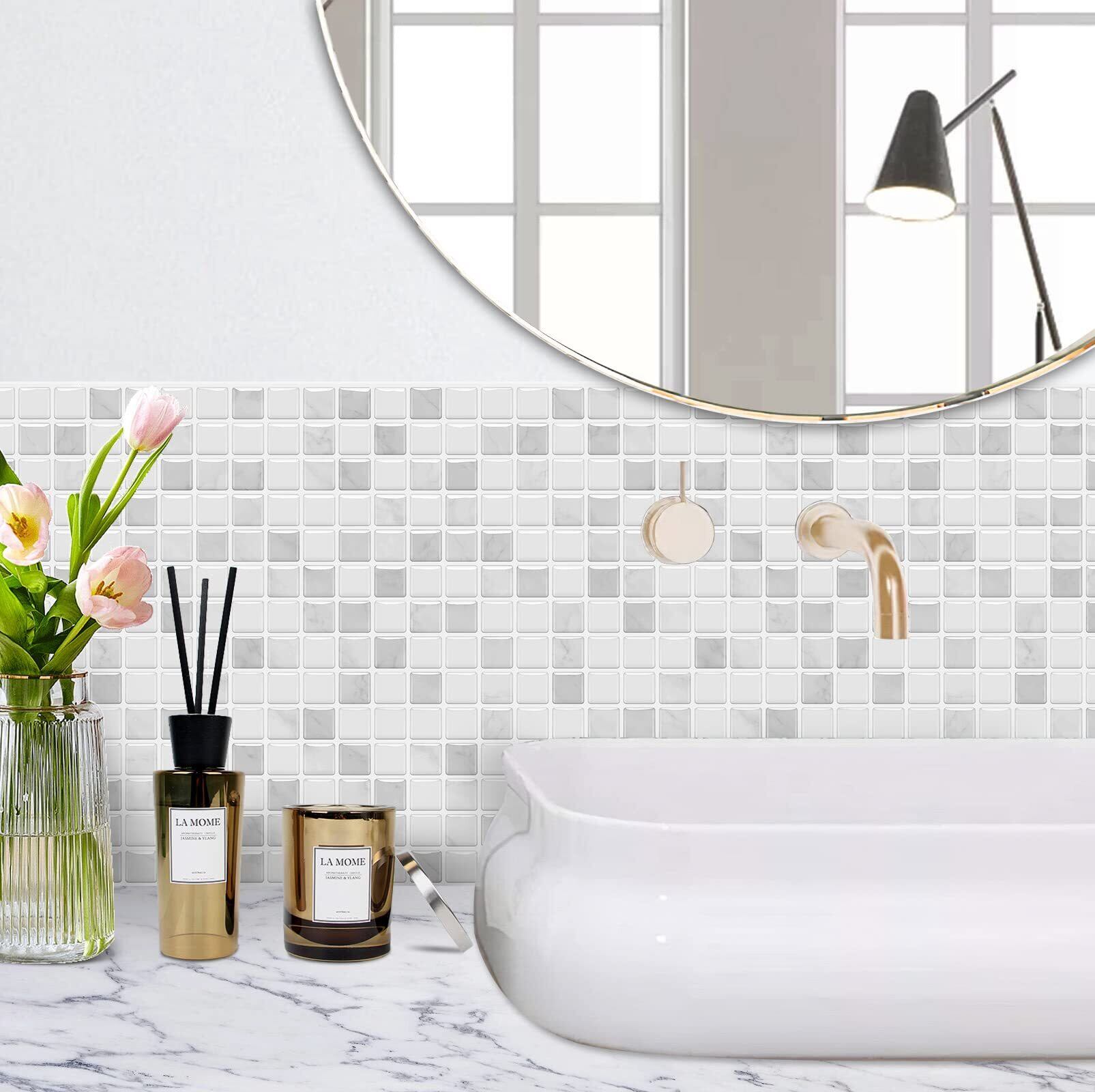 【特価商品】MORCART タイルシール 防水 耐熱 キッチン 洗面所 トイレ DIY 家具やアイテムの装飾 モザイクタイルシート 壁紙シール 3D リメイクシート (25x25cm, 4枚, グレー) | gsmshop