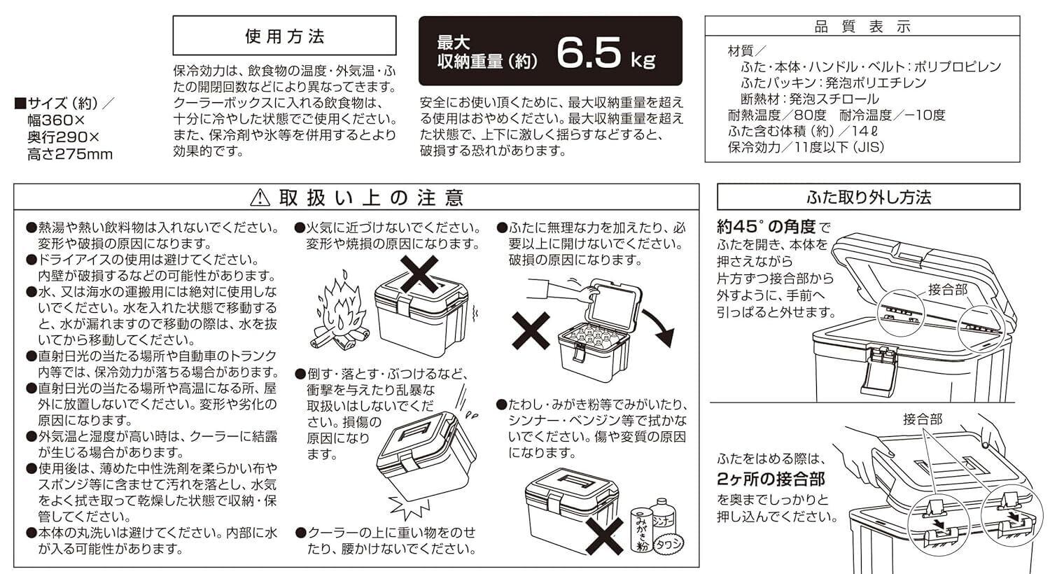 材質:ふた・本体・ハンドル・ベルト/ポリプロピレン、ふたパッキン/発泡ポリエチレン、断熱材/発泡スチロール、耐熱温度/80度、耐冷温度/-10度、原産国:日本