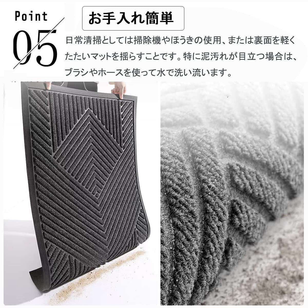【お手入れ簡単】日常清掃としては掃除機やほうきの使用、もしくは裏面を軽くたたいマットを揺らすことで十分です。特に泥汚れが目立つ場合は、ブラシやホースを使って水で洗い流すのもよろしいです。