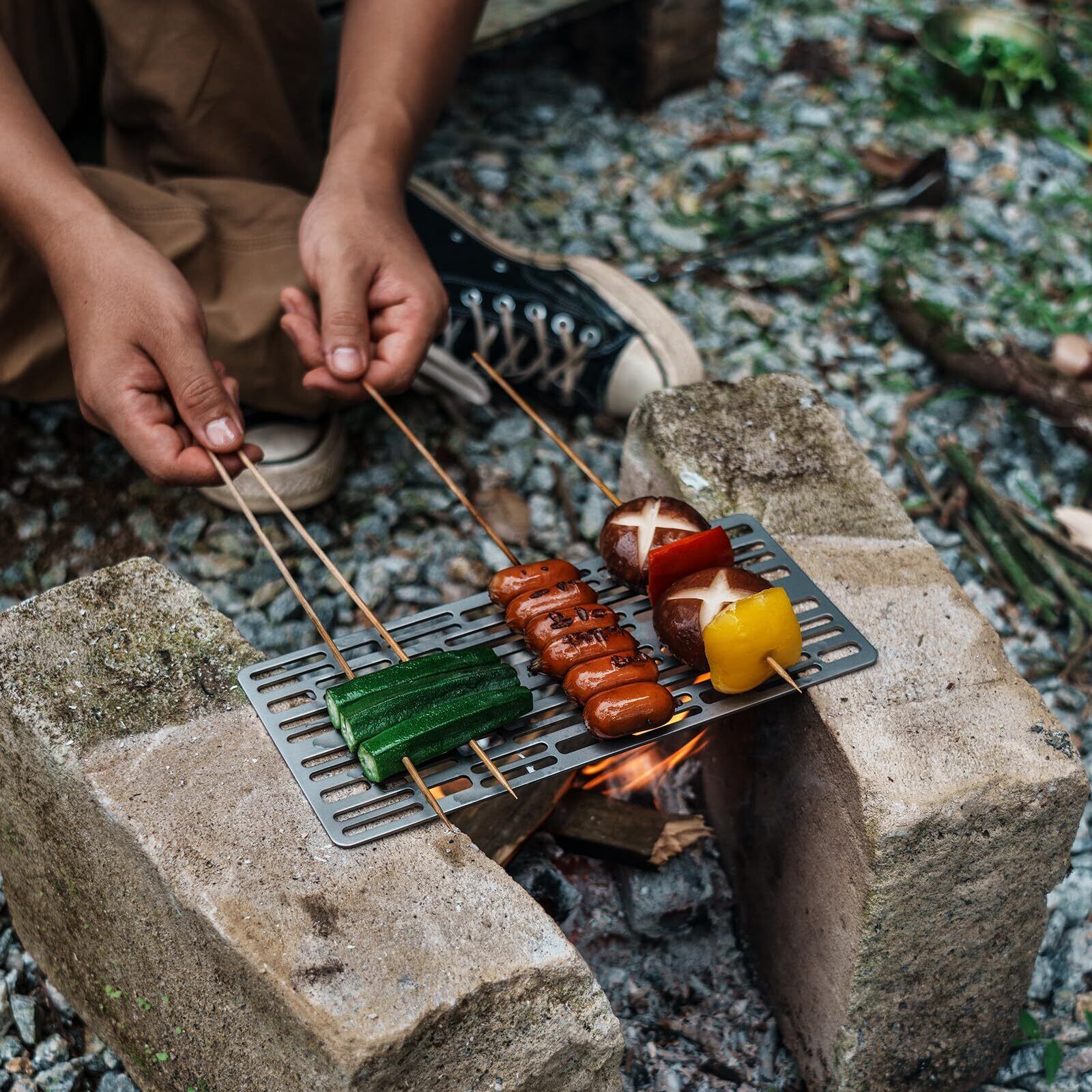 【場所を選ばず簡単設置】 ちゃんとした焚火台がなくてもいくつかの岩と燃料があればBBQを楽しめる手軽さも魅力です。