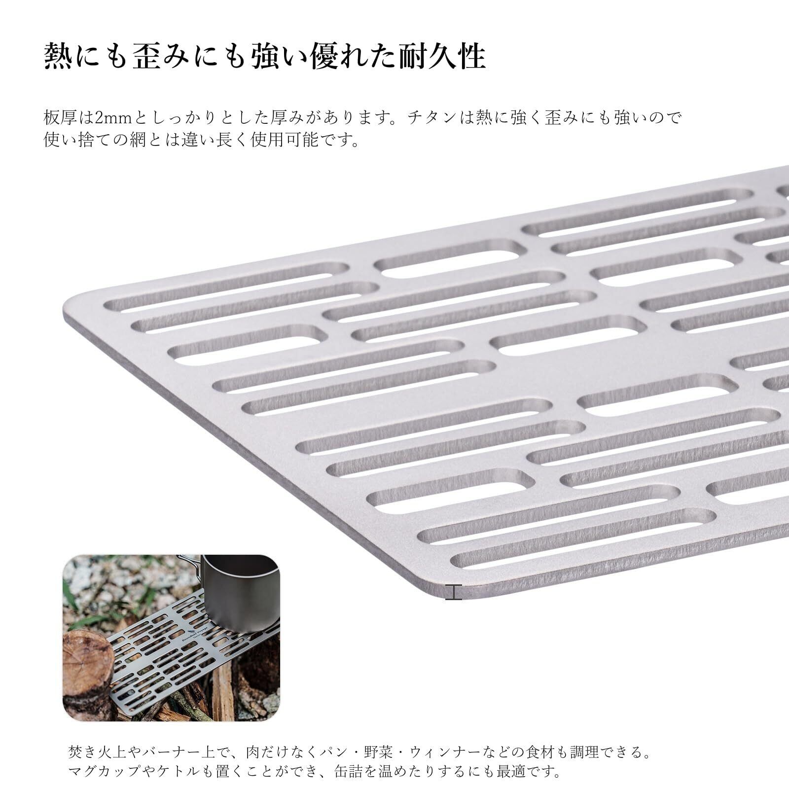 【軽くて強いチタン製焼き網】:本製品の焼き網は純チタンを採用となり、軽量かつ丈夫で、サビや熱に強い素材です。強度もあり、耐食性にも優れ、金属臭いも無くて魅力あふれる安全な金属です。