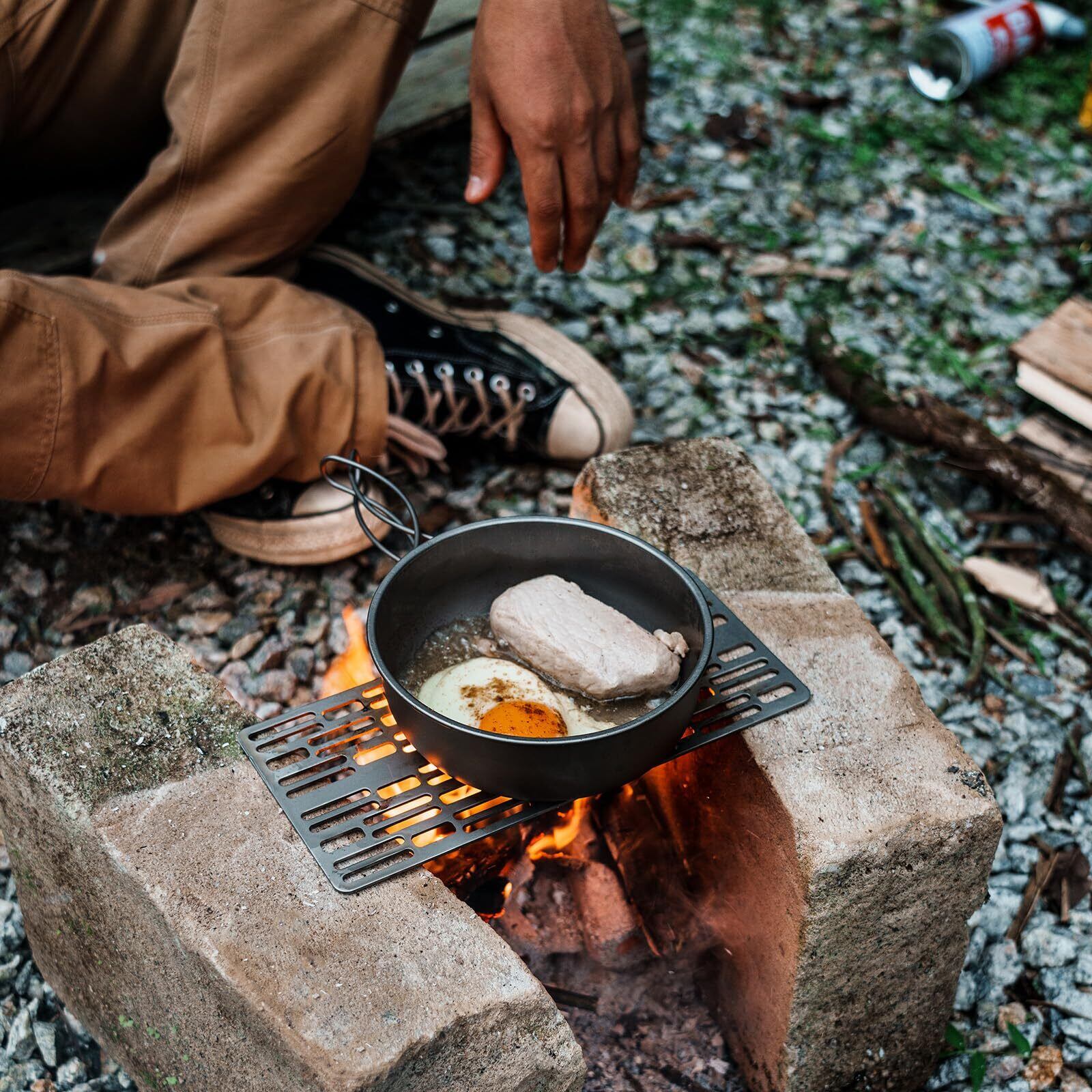 【抜群の使用感】:焚き火上やバーナー上で、肉だけなくパン・野菜・ウィンナーなどの食材も調理できる鉄板。鍋やケトルも置くことができ、缶詰を温めたりするにも最適です。