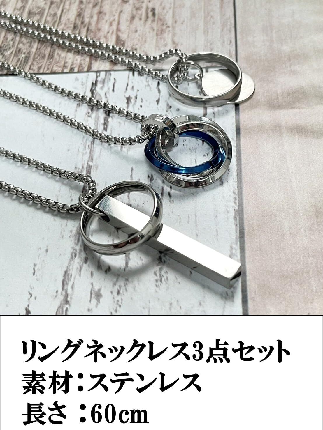 【商品仕様】留め金具:カニカン、長さ60cm、幅2.5mm、デザイン:円形リングと3連リングとスティックリング各一本、合計で3本入りのネックレスセットです。服装やお出かけ先によって使い分けができます。シンプルですがオシャレな雰囲気を醸し出す感じのデザインになっております。
