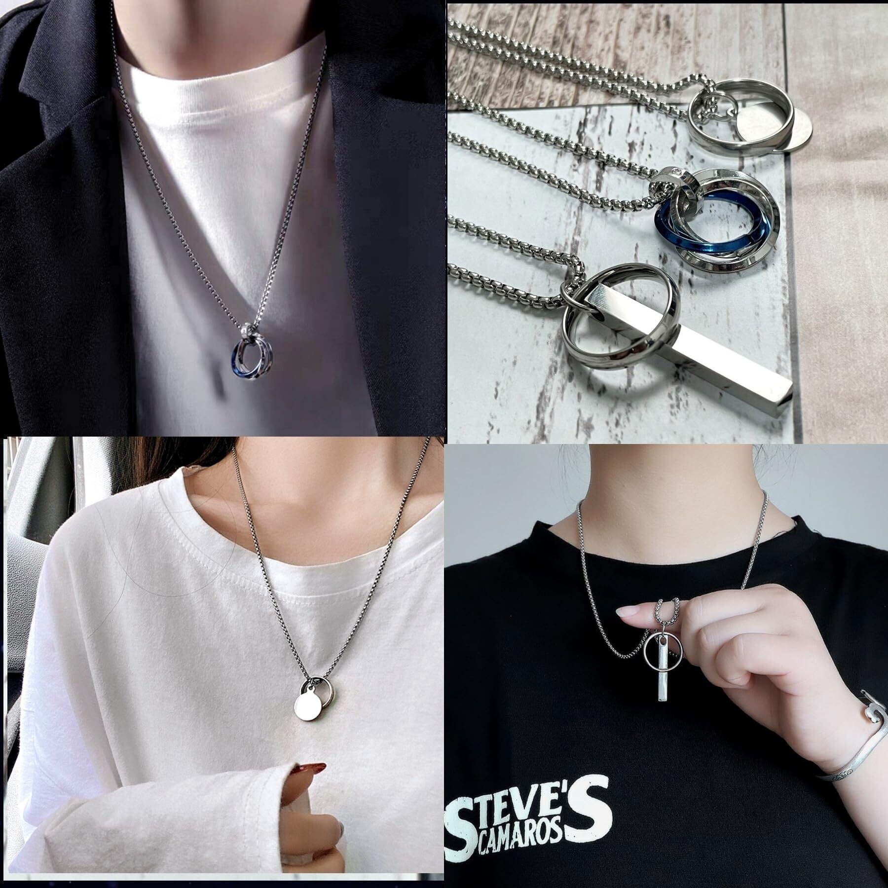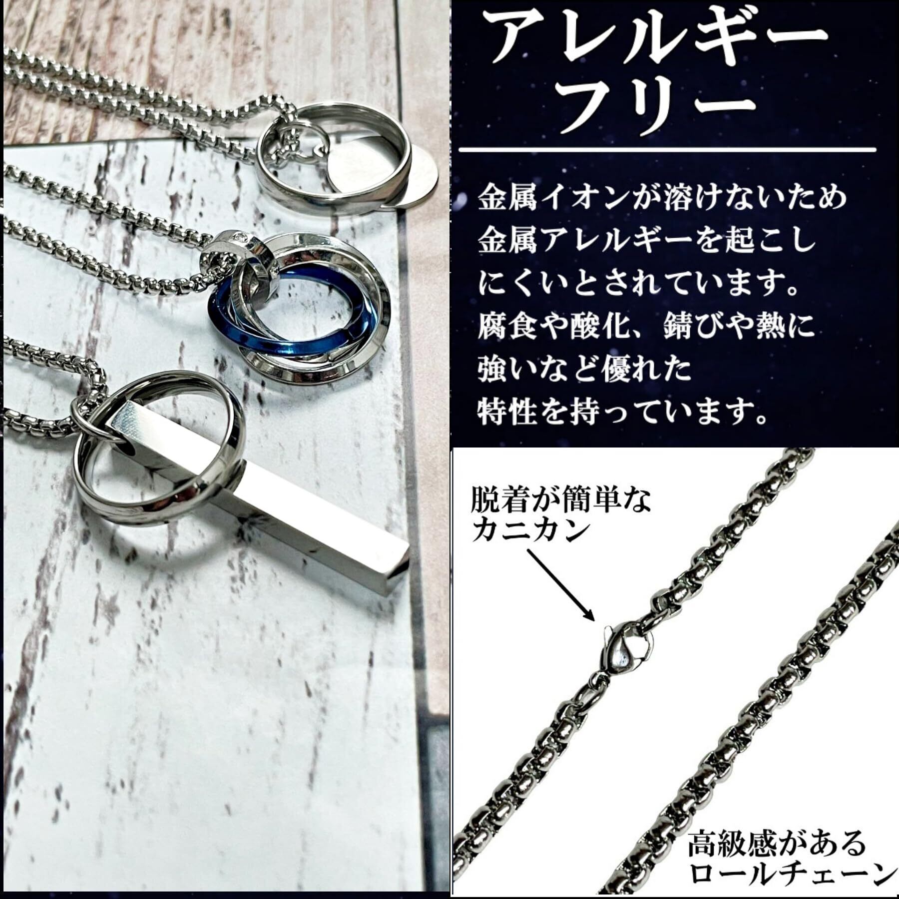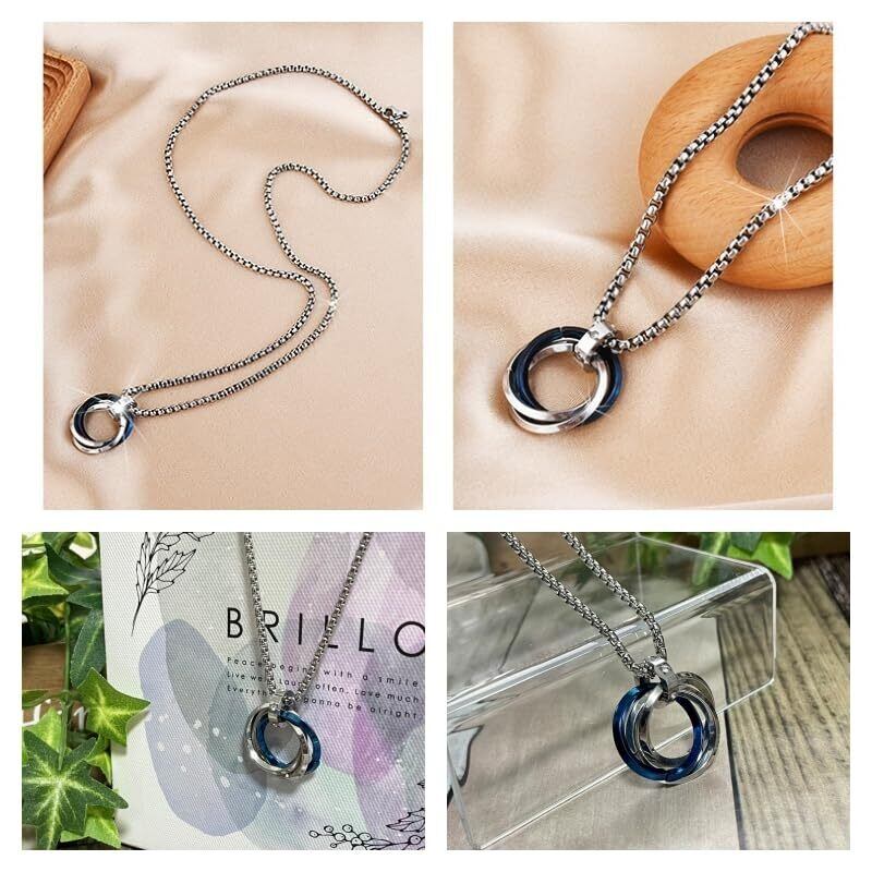 [YAHANE] ネックレス メンズ ペンダント ダブルリング 3連リング シンプル ステンレス アクセサリー シルバー ブルー ブラック ゴールド トップ ジュエリー アレルギーフリー 防水