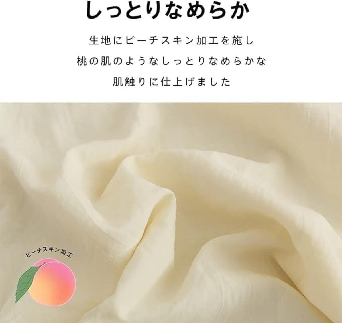 【肌触り】生地にピーチスキン加工を施しました。きめ細やかな起毛により柔らかくなめらかな風合いはまるで桃の肌に包まれるような肌触りをお楽しみいただけます。また、水洗い加工で自然なやわらかさに仕上げました。