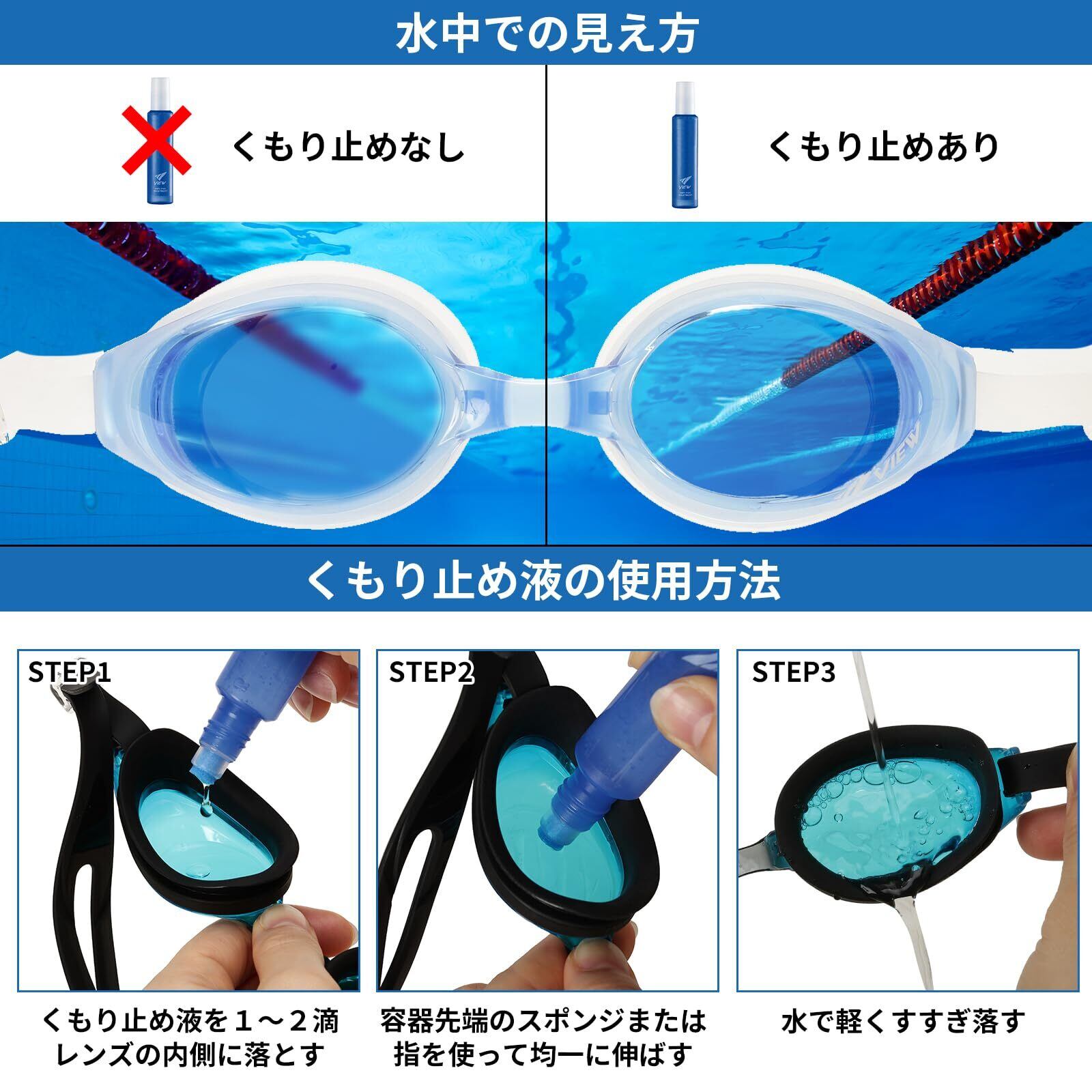 レンズガード付きで落としてもレンズに傷がつきにくく長持ち! 、取り違えを防ぐネーム記入欄付き、くもり防止機能 / UVカット機能搭載、くもり止め 15ml付き、選べる鼻ベルト:S/M/L、日本製