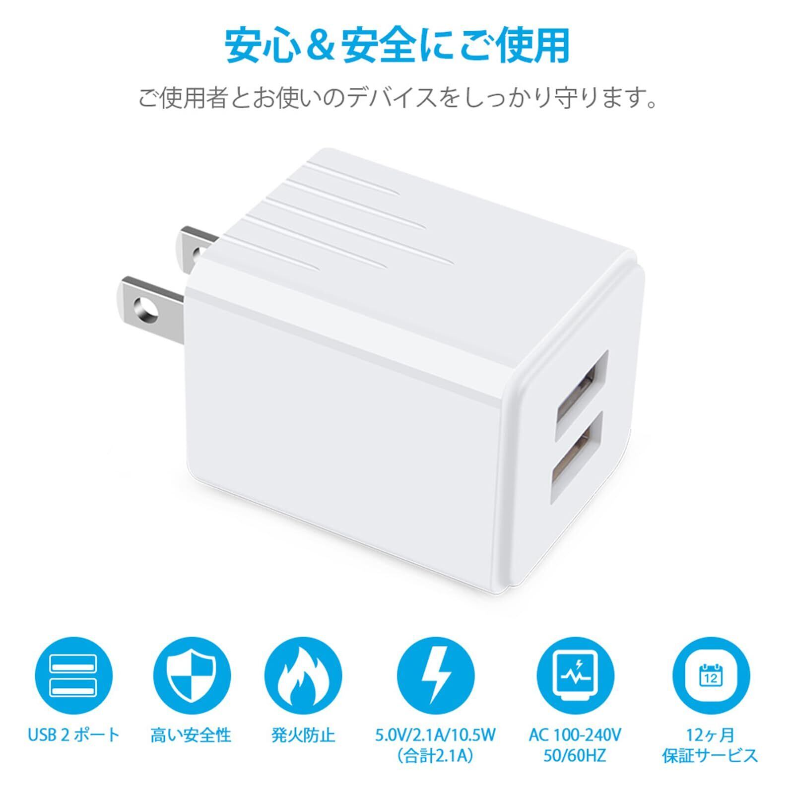 「急速充電できる2ポートUSBアダプター」:超コンパクトな設計で、2つのUSB充電ポートも搭載し、単ポート最大出力電流が2.1Aなので、スマホ充電時間を短縮可能です。また、該当ACアダプターは100~240Vの電圧対応、お宅、オフィスだけでなく、海外出張、旅行にも最適です。サイズ:(約)29*31*38mm、重さ:30g。