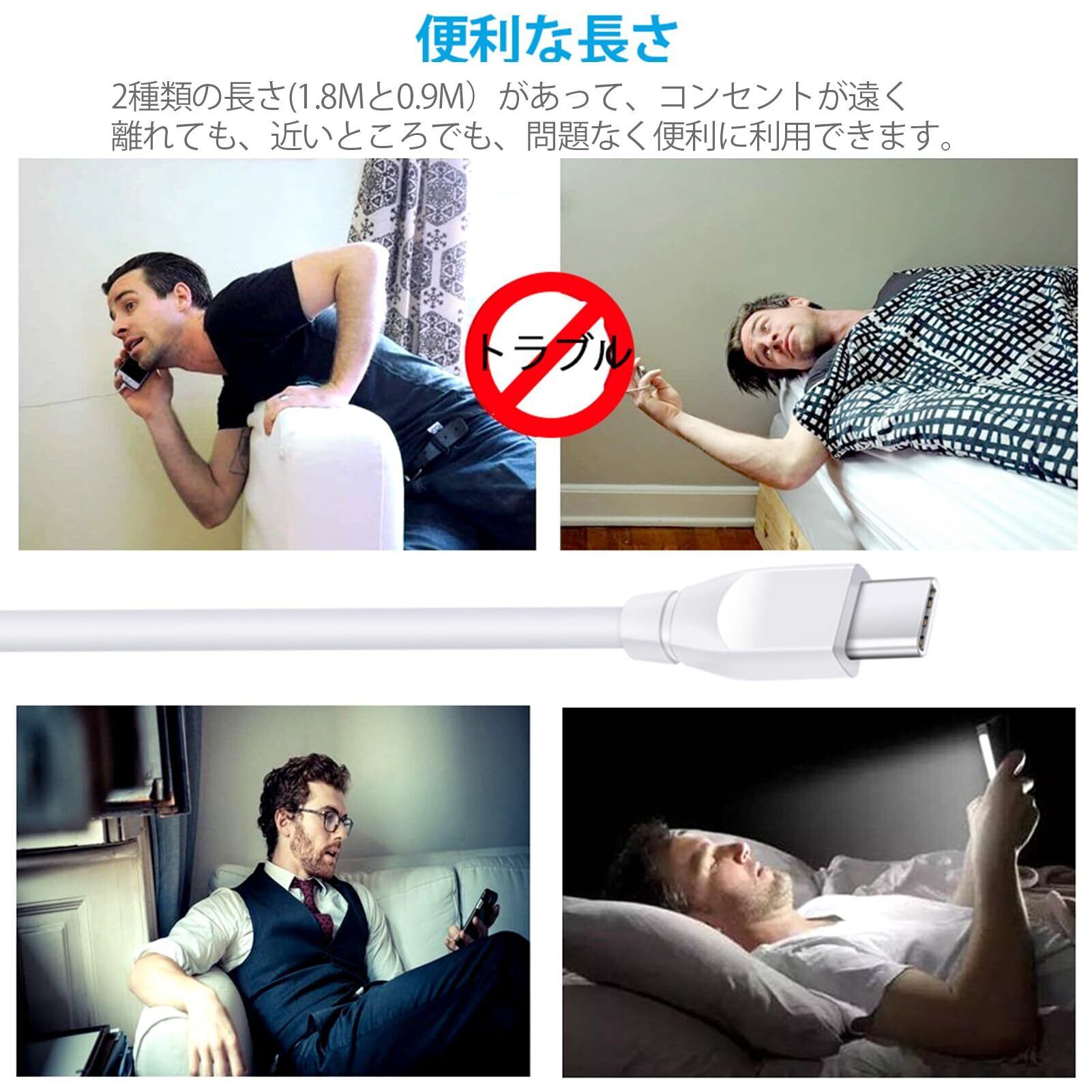 「高耐久のType-Cケーブル」:高品質なTPEで20000回以上の曲げ試験に合格し、28/18AWGの二重銅コア、耐腐食性と耐久性があるアルミニウムコネクタを採用して、耐久性をもっとアップされます。180CMと90CMの2種類の長さで、離れた場所で寝ながら操作もできますし、車載、寝室、ソファ、バルコニー使用にも最適です。