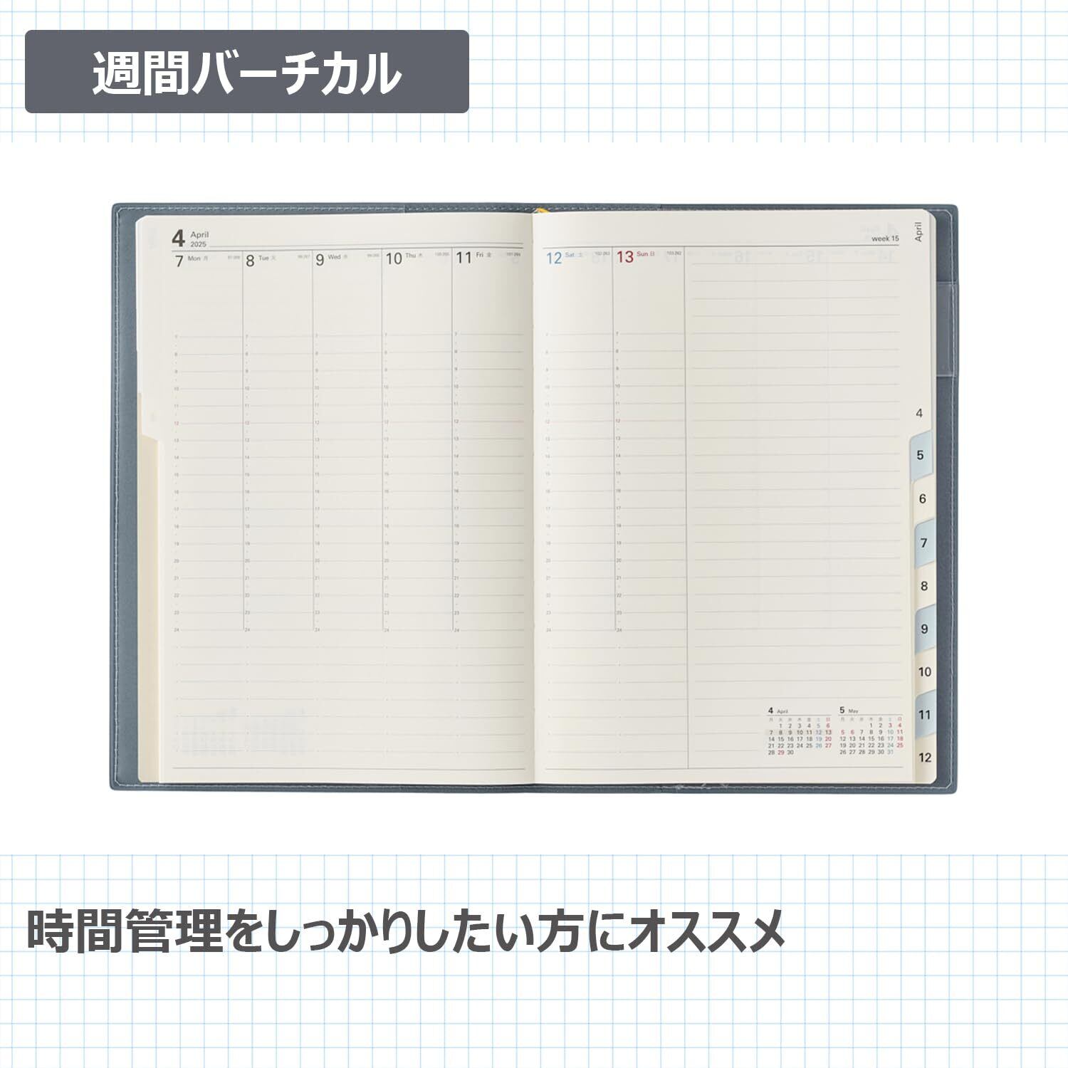 【週間ページ】見開き1週間で全面に時間軸を配置したバーチカルタイプにメモスペースも確保した充実のレイアウト。細かなスケジュール管理に加え、その週のメモも取りたいという方におすすめです。
