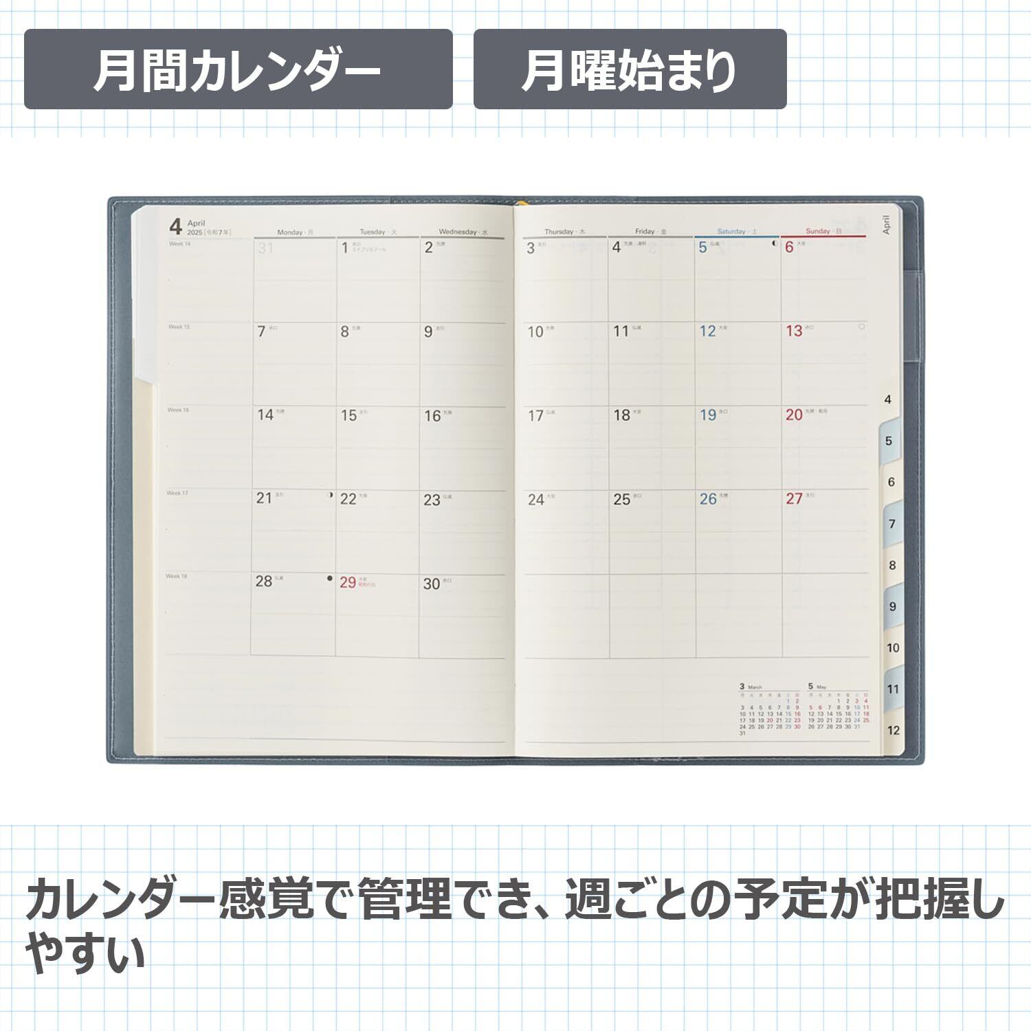 月間と週間が連続したページ構成で、月ごとにまとめて予定を組むのに適しています。