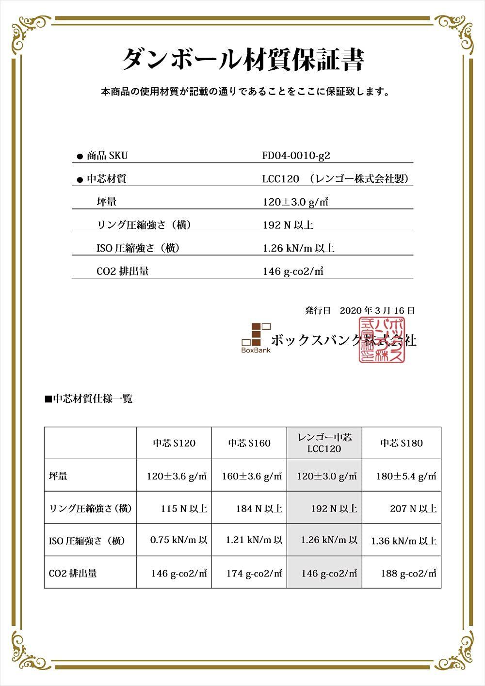 材質: Cフルート (強化中芯120 - 坪量120±3.0g/㎡、リング圧縮強さ: 192N以上、ISO圧縮強さ: 1.26kN/m以上、CO2排出量: 146g-co2/㎡) ●世界的には【省資源・省エネルギーにつながり、環境に優しい】 厚さ4mmのCフルート段ボールが主流となっています。