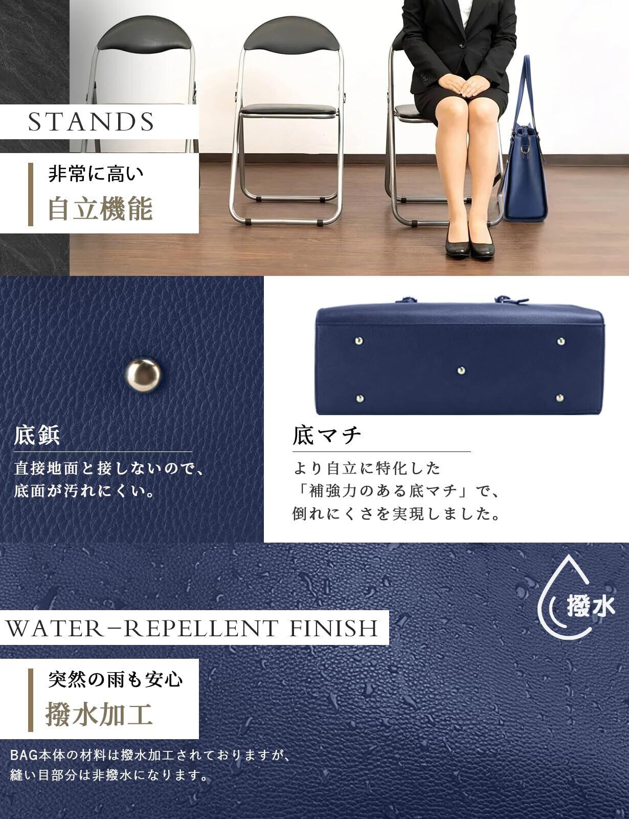 【自立機能、リクルートに最適!】バックの底に鋲が5つ付いております、直置きでも傷や汚れからバックを守ります。打ち合せの際などに壁に立てかけずに、自分の足元に置いてスマートさを演出することができます。