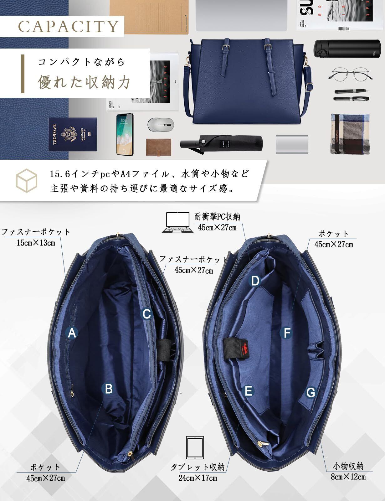 【超大容量、好きに收納は可能!】ビジネスに必要なノートパソコンも分厚い資料もこれーつで十分。内側にA4サイズの書類、15.6型のPCとタブレットを同時に収納可能な大容量タイプ、更に複数ポケットがあり、手帳、折りたたみ傘などの小物を整理しやすく取り出しやすくになり、カバンの中が綺麗に保たれます。衝撃を保護するクッション素材を採用し、ビジネスバッグの中身の物もしっかり守ります。