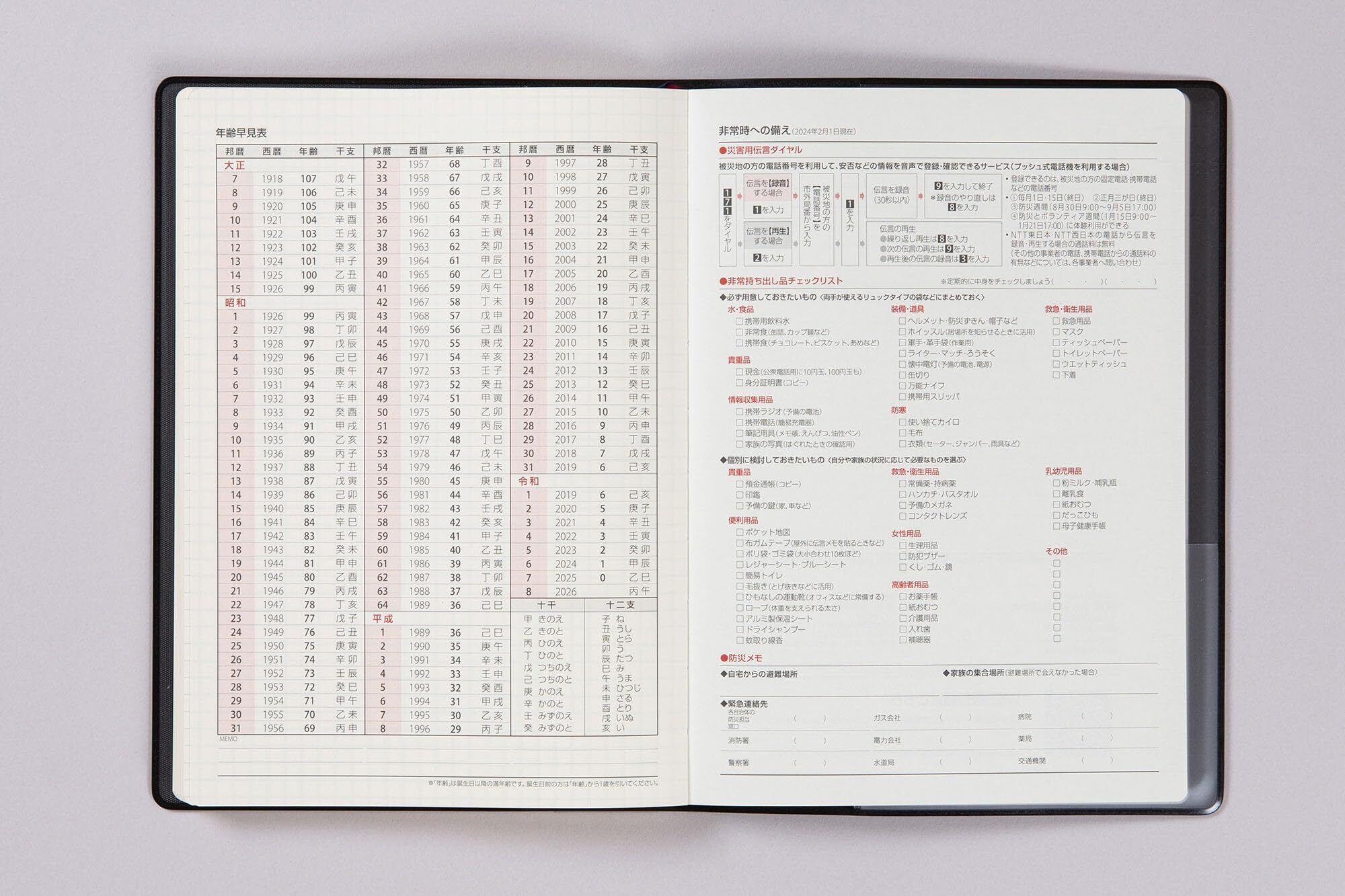 【商品詳細2】表紙タイプ:皮革調 ●刷色:2色刷 ●ページ数:192頁 ●スペック:切り取りインデックス ●付録:年齢早見表,非常時への備え,方眼メモ ●別冊:横ケイメモ,方眼メモ,切り取りメモ