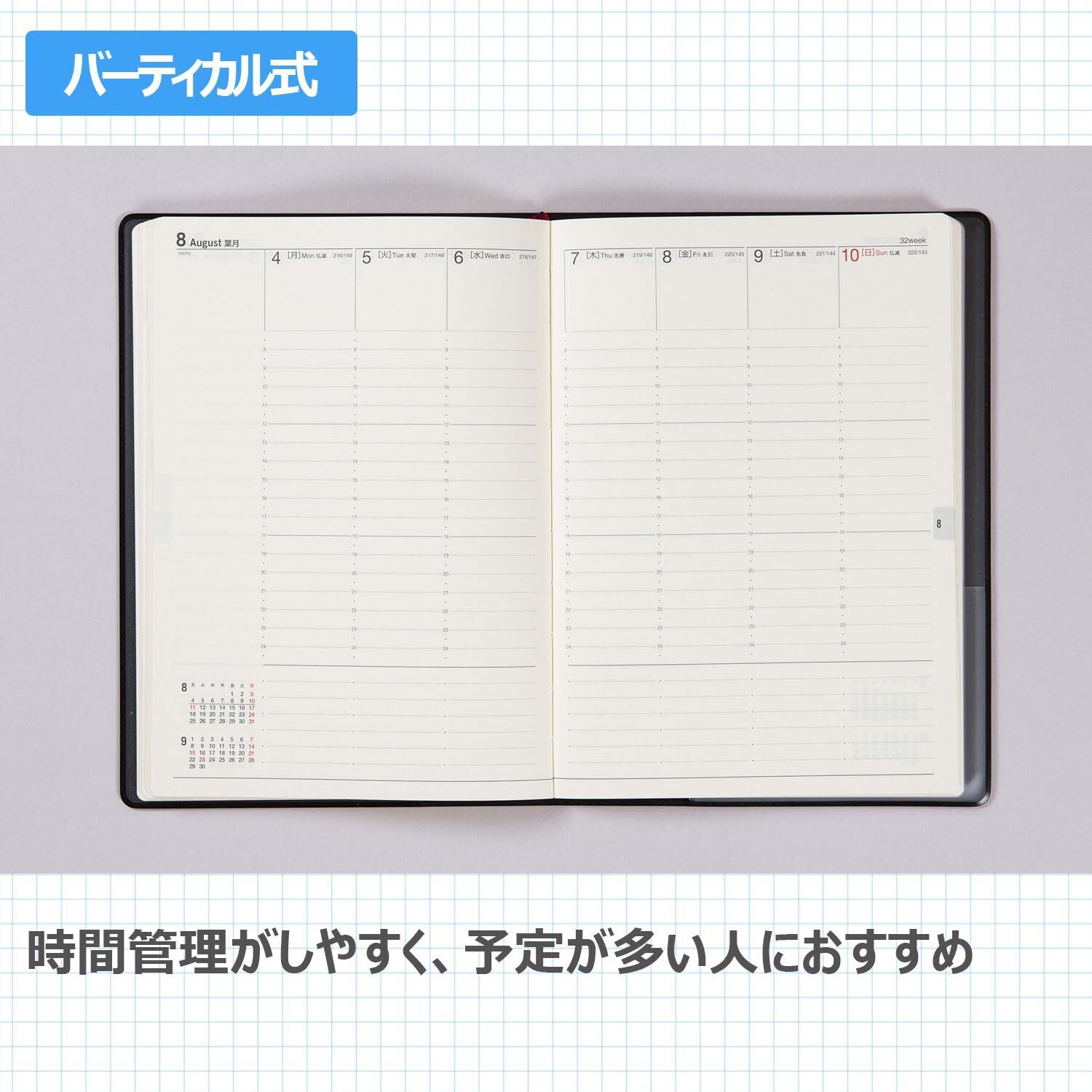 【月間予定欄:ブロックタイプ】シンプルで予定を把握しやすい月間カレンダー。ページの左端は横ケイのメモ欄になっています。 <BR>【週間予定欄:バーティカル式】空いている時間を把握しやすいバーティカル式。7日間の記入スペースが均等なので、毎日同じペースで記録できます。