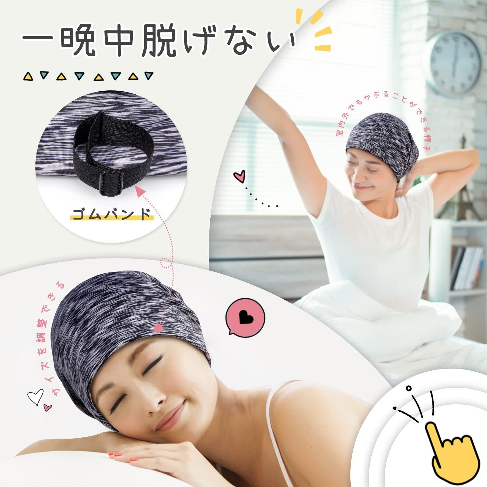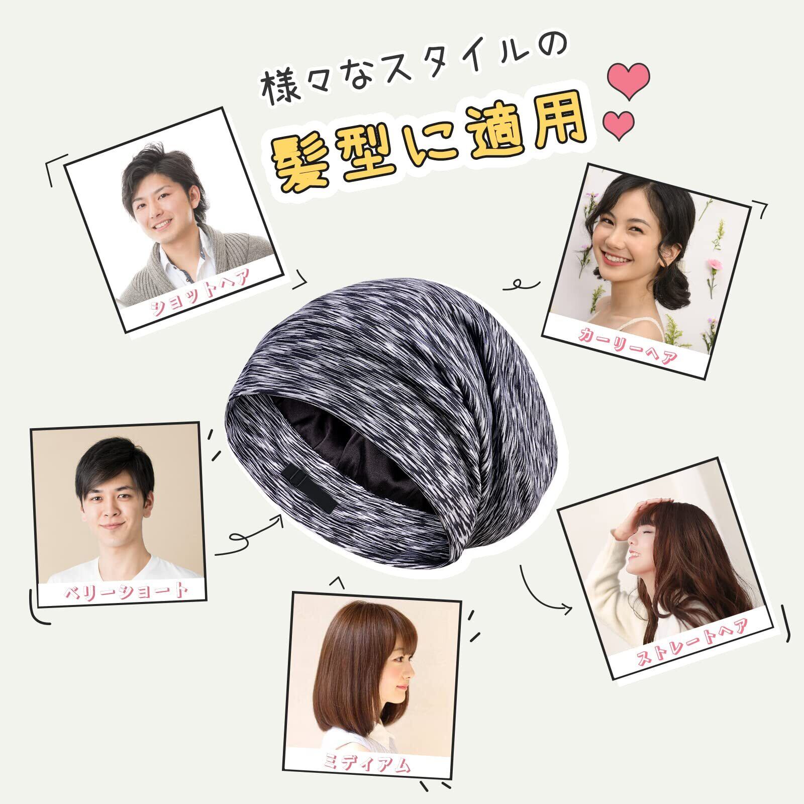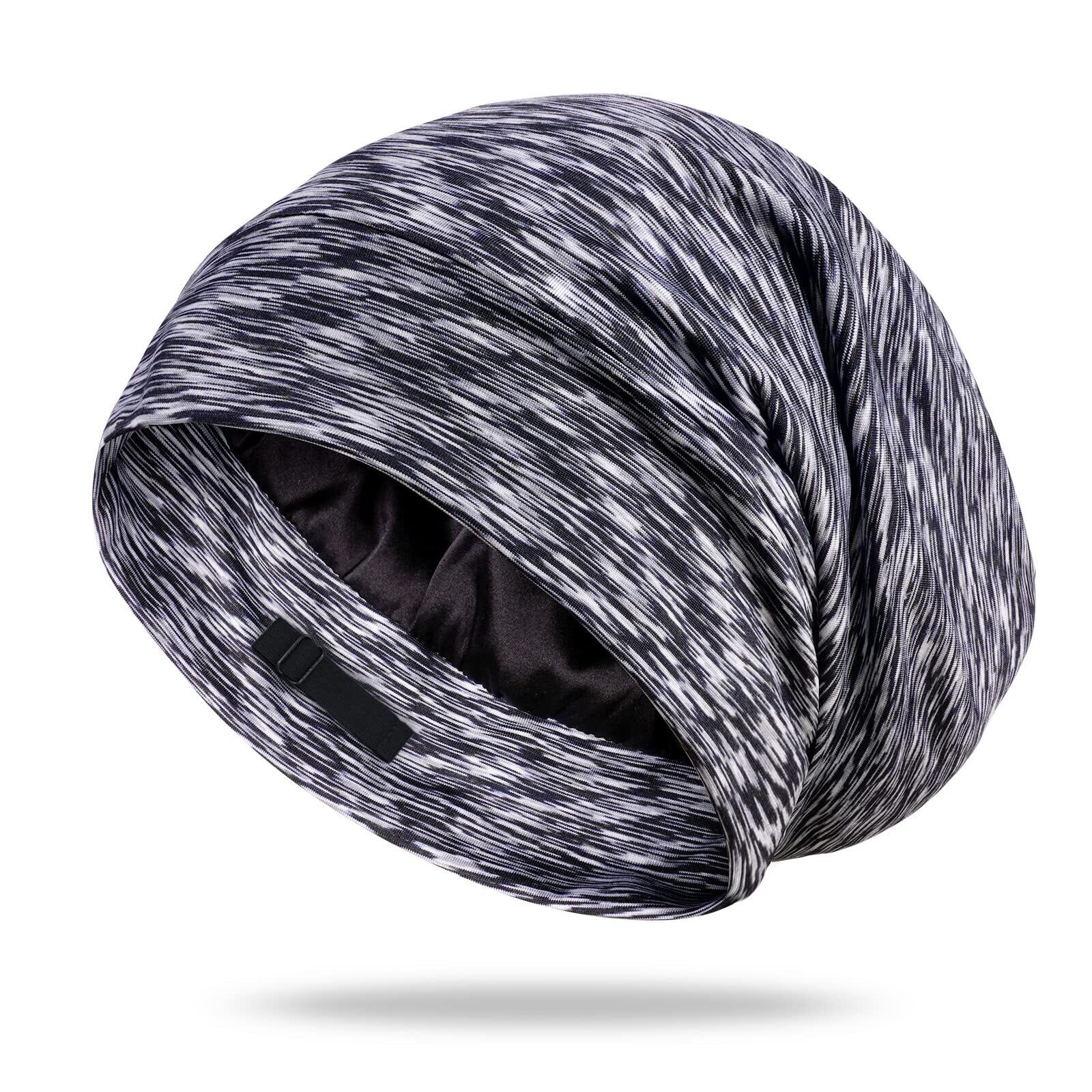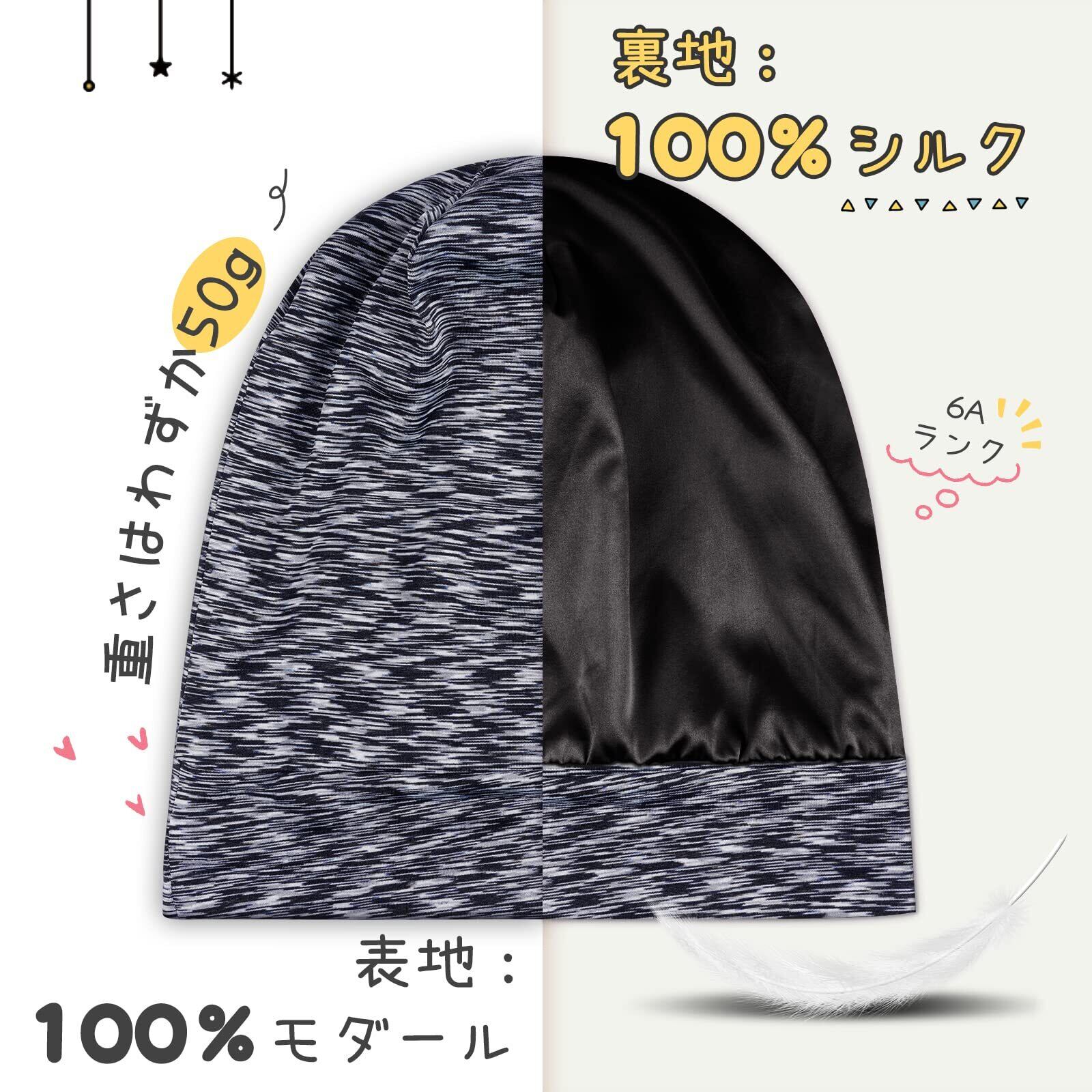 【独特なデザイン】裏地:6Aクラス19匁シルク100% 表地:モダール ナイトキャップは100%マルベリーシルクでできており、外側にモーダル(レーヨン)が付いています。 モーダルはしわになりにくく、柔らかい触手で、お手入れが簡単で、自由に折りたたむことができます。内側にシルクは、髪を保護するのに十分なほど滑らかで柔らかいです。注意:裏地の色はブラックとライトグレーの2色があり、ランダムにお客様にお送りします。天然シルクなので、届いたばかりの商品は匂いが少しありますが、洗濯すると消えます。