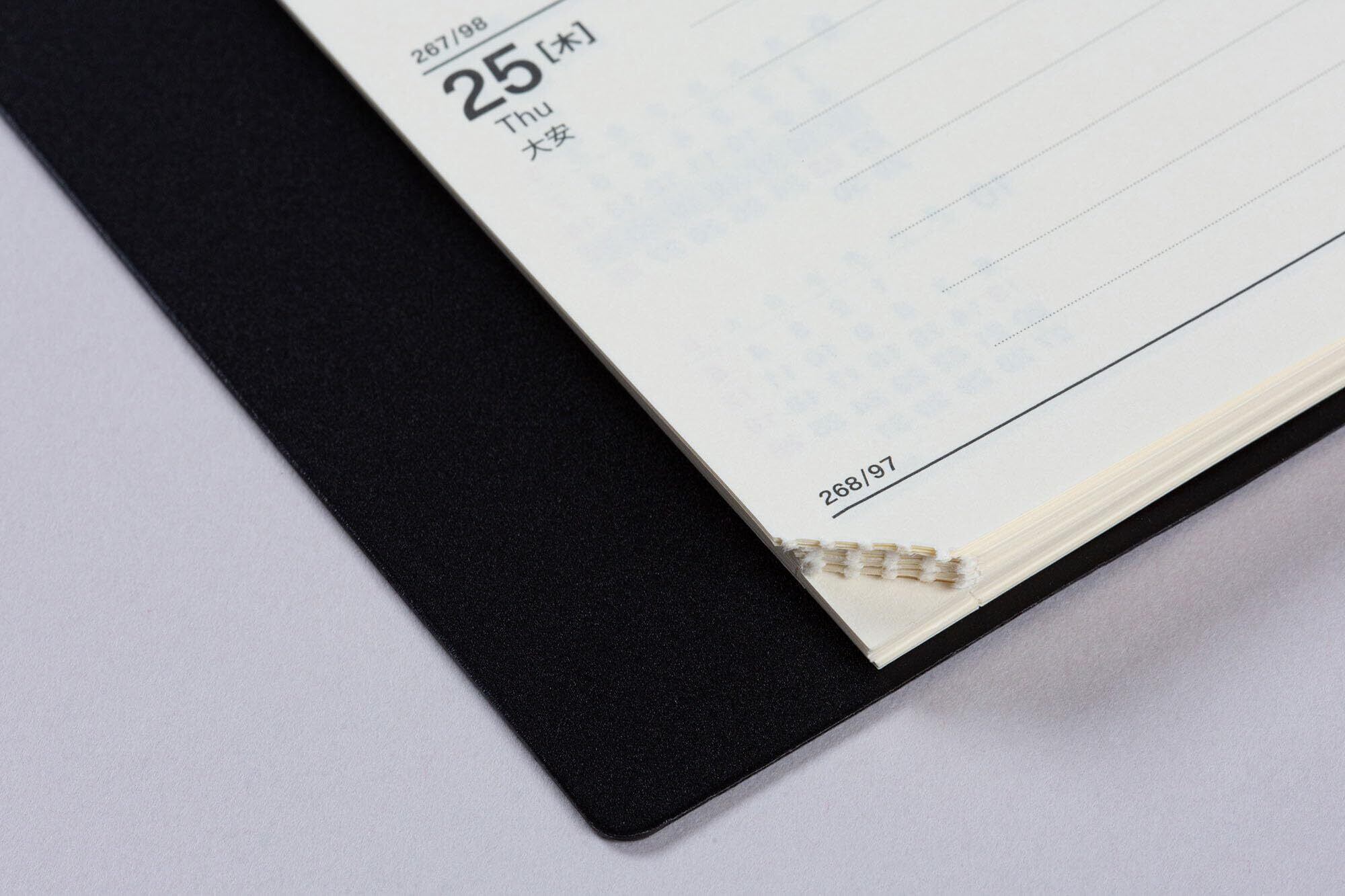【毎日使い続けられる丈夫な製本】洗練された加工技術を使って美しい仕上がりを追及。見た目では分からないほどの多くの工程による丁寧な加工によって耐久性を高めながら、手帳本体にぴったりとフィットするクオリティを追及しています。しおりひもは一本一本丁寧に特別に作られた、ほつれにくく耐久性の高いしおりひもを使用しています。