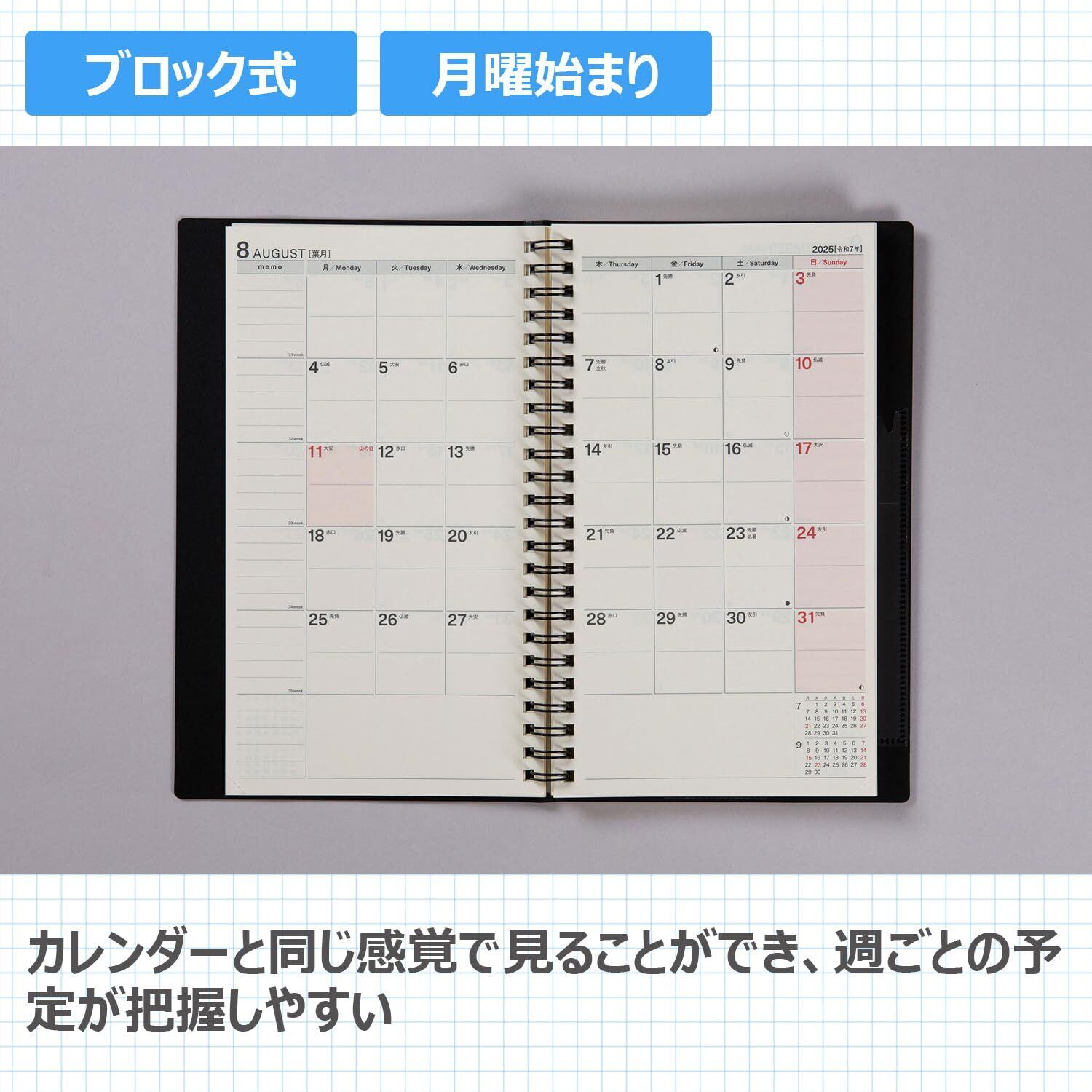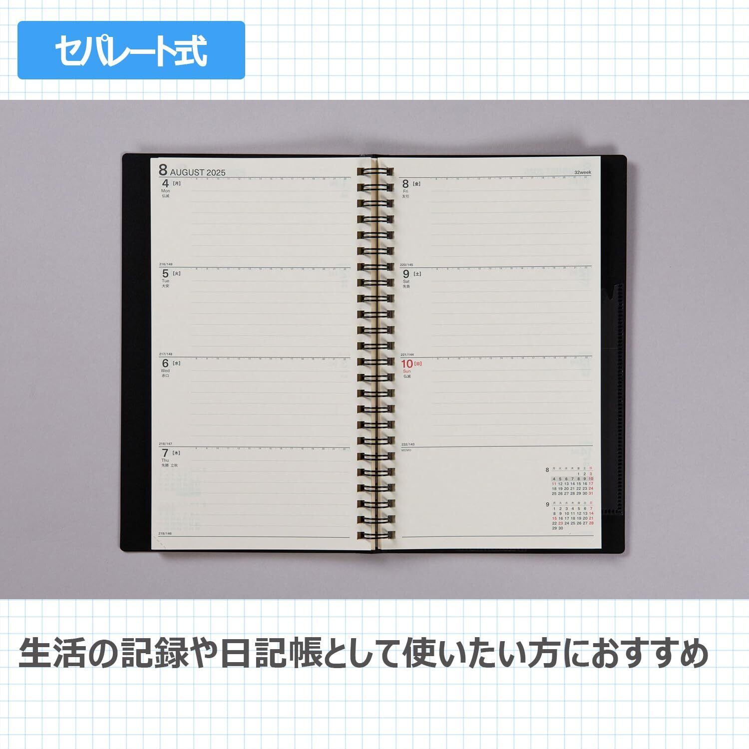 【月間予定欄:横ケイタイプ】週をまたぐ予定を管理しやすい横ケイ式カレンダー。巻頭に1年分まとまっています。記入欄が横に長いので記入がしやすく、一覧性に優れています。 <BR>【週間予定欄:セパレート式】左ページに4日、右ページに3日とメモ欄の見開き1週間。スケジュール欄にはタイム目盛りりも付いています。1日ごとにしっかり書きたい人に。メモスペースもあるので、たっぷり記入できます。