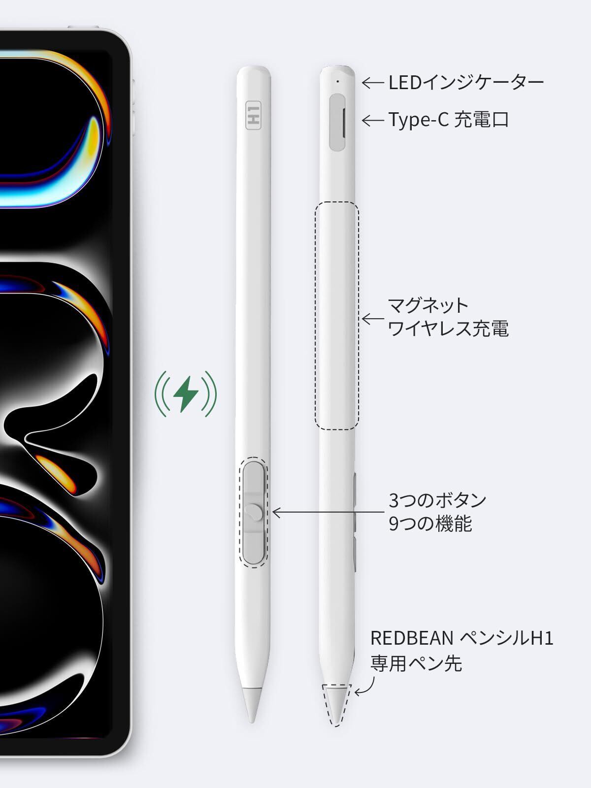 REDBEAN iPad用 スタイラスタッチペン H1、9つのショートカット機能を持つ3つのボタン、アップルペンシル互換、傾き感知、磁気ワイヤレス充電、誤作動防止機能 - iPad Pro 11"/12.9"、Air 3/4/5、Mini 5/6、iPad 6-10世代用のApple Pencil代替品、交換用ペン先付属