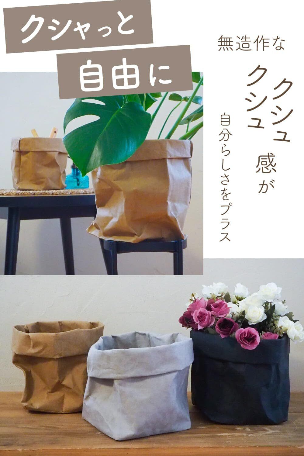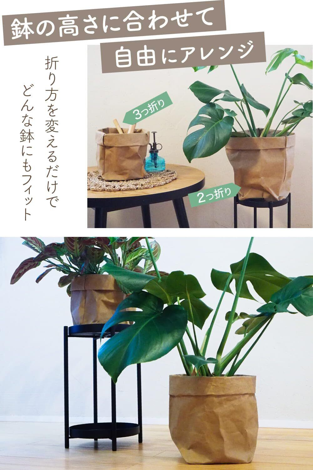 また、このプランターカバーはチェアカバーやバスケットなどのインテリアアイテムとも相性が良く、統一感をもたらします。サイズとカラーを自由に組み合わせることで、鉢のデザインを整え、おしゃれなインテリア空間を作り出すことができます。この鉢カバーは、上部を折り曲げて高さを自由に調整できます。観葉植物や植木鉢のサイズに合わせてフィットさせられる便利なアイテムです。