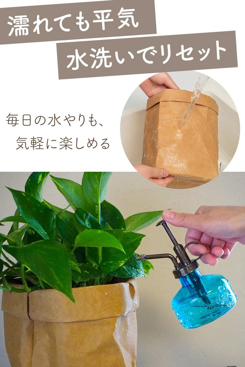 この鉢カバーはドイツ製のクラフト素材で作られており、ナチュラルな風合いが特徴です。完全防水ではないため、水やりや霧吹きの際には水受けや受け皿を併用することを推奨しますが、耐久性が高く破れにくいため、長期間使用できます。使わない時にはコンパクトに折りたたんで収納でき、室内外問わず便利に使えます。