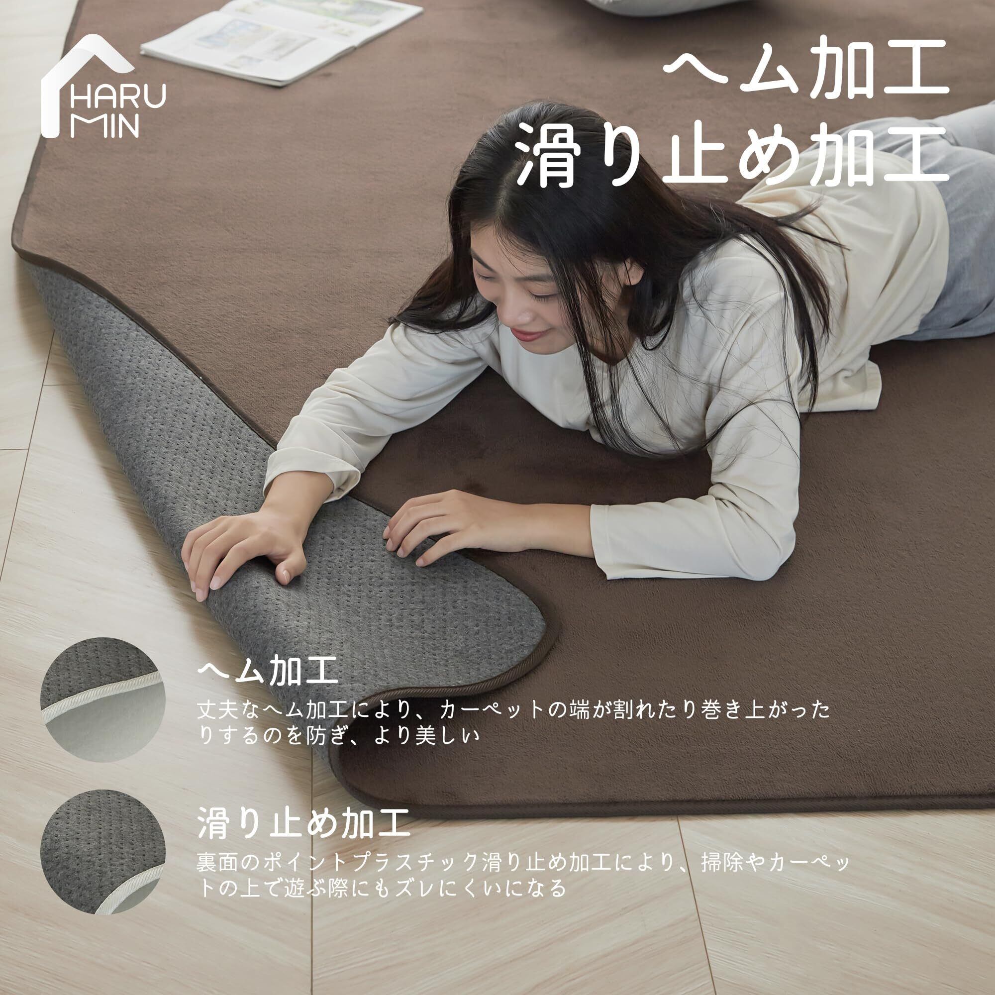 【滑り止めでズレにくく、まるで床に貼りついているかのようなカーペット】丈夫なエッジ加工と底部の点プラスチック加工により、上で走ったり飛び跳ねたり、また掃除機をかけても移動しにくくなっており、子供やペット、お年寄りのいるご家庭におすすめです。