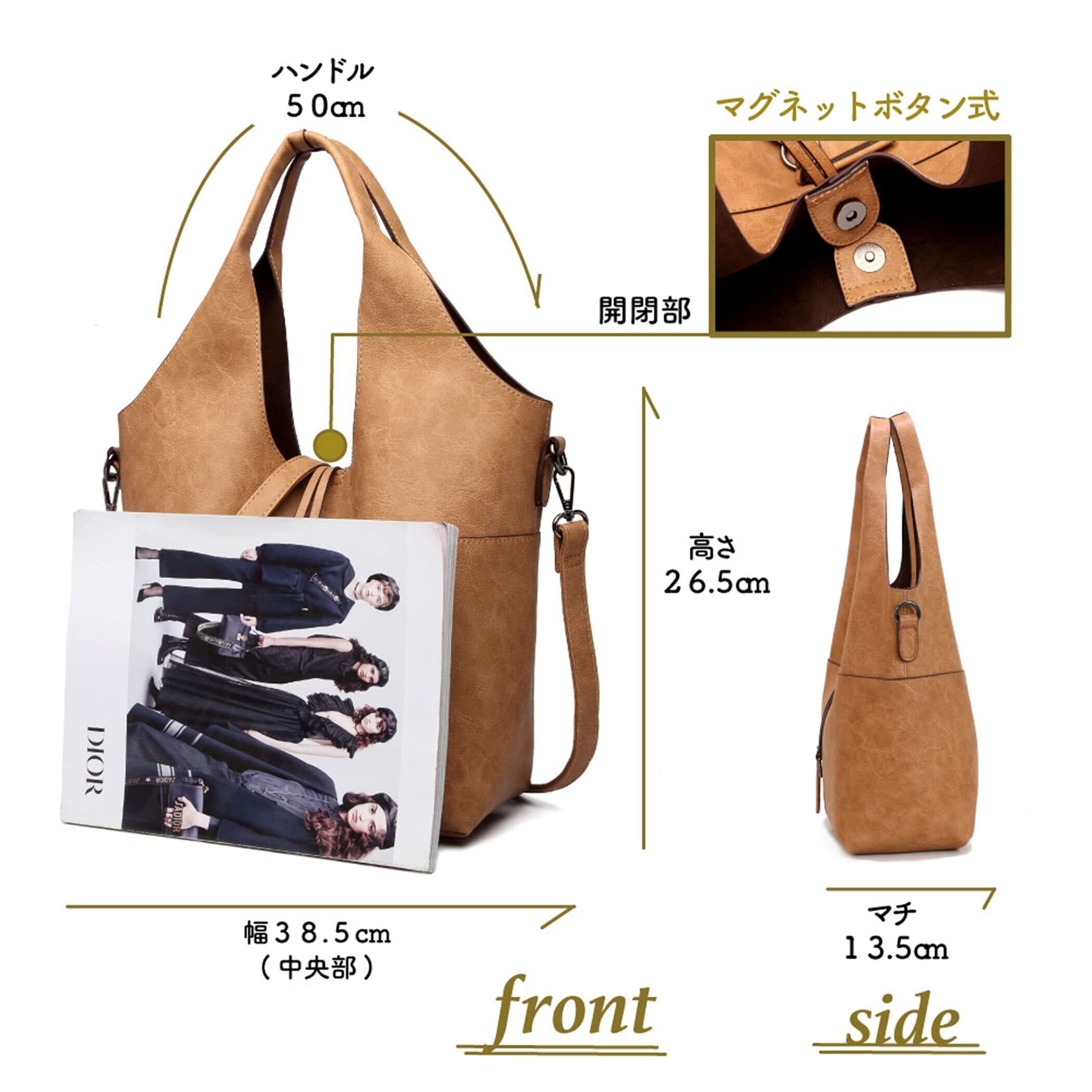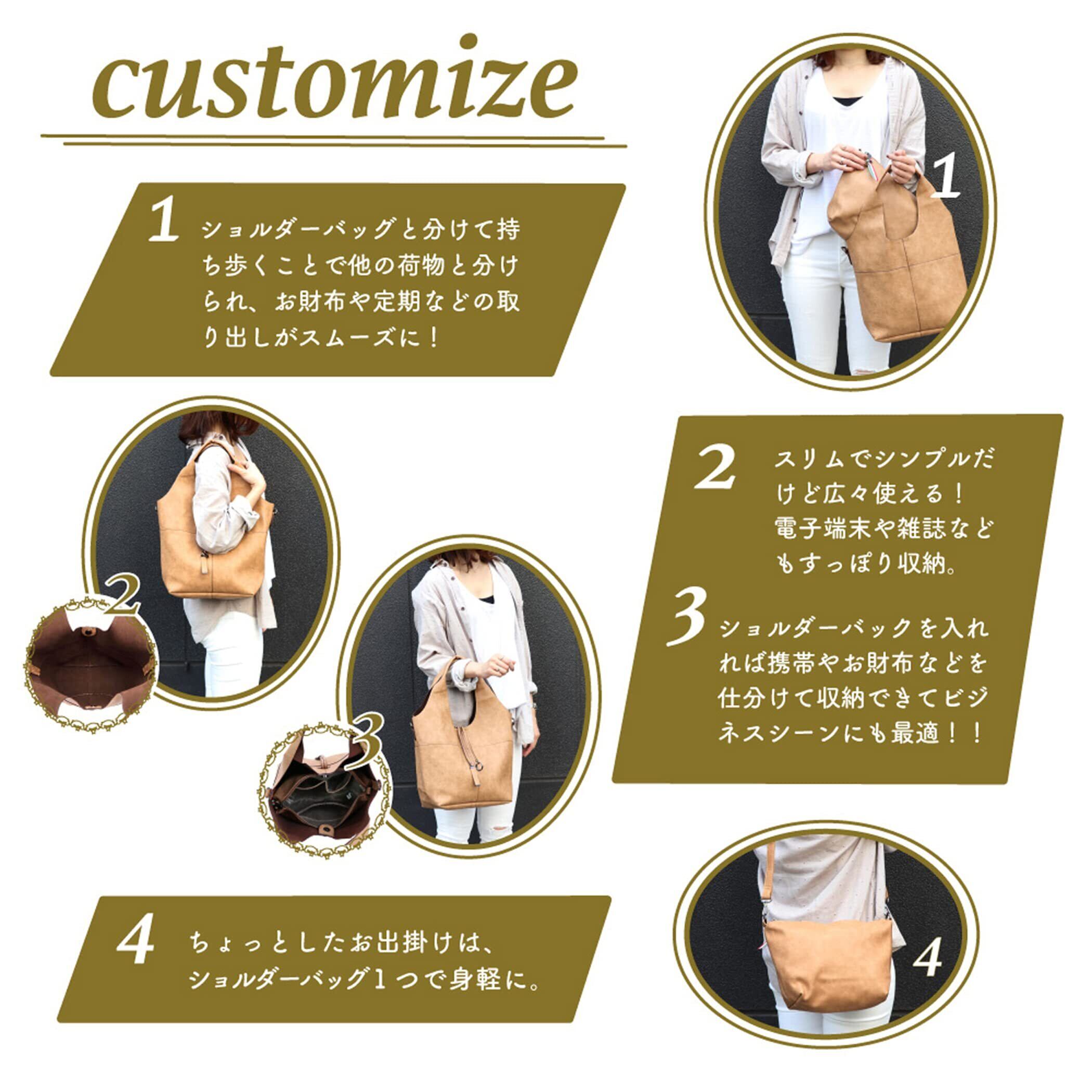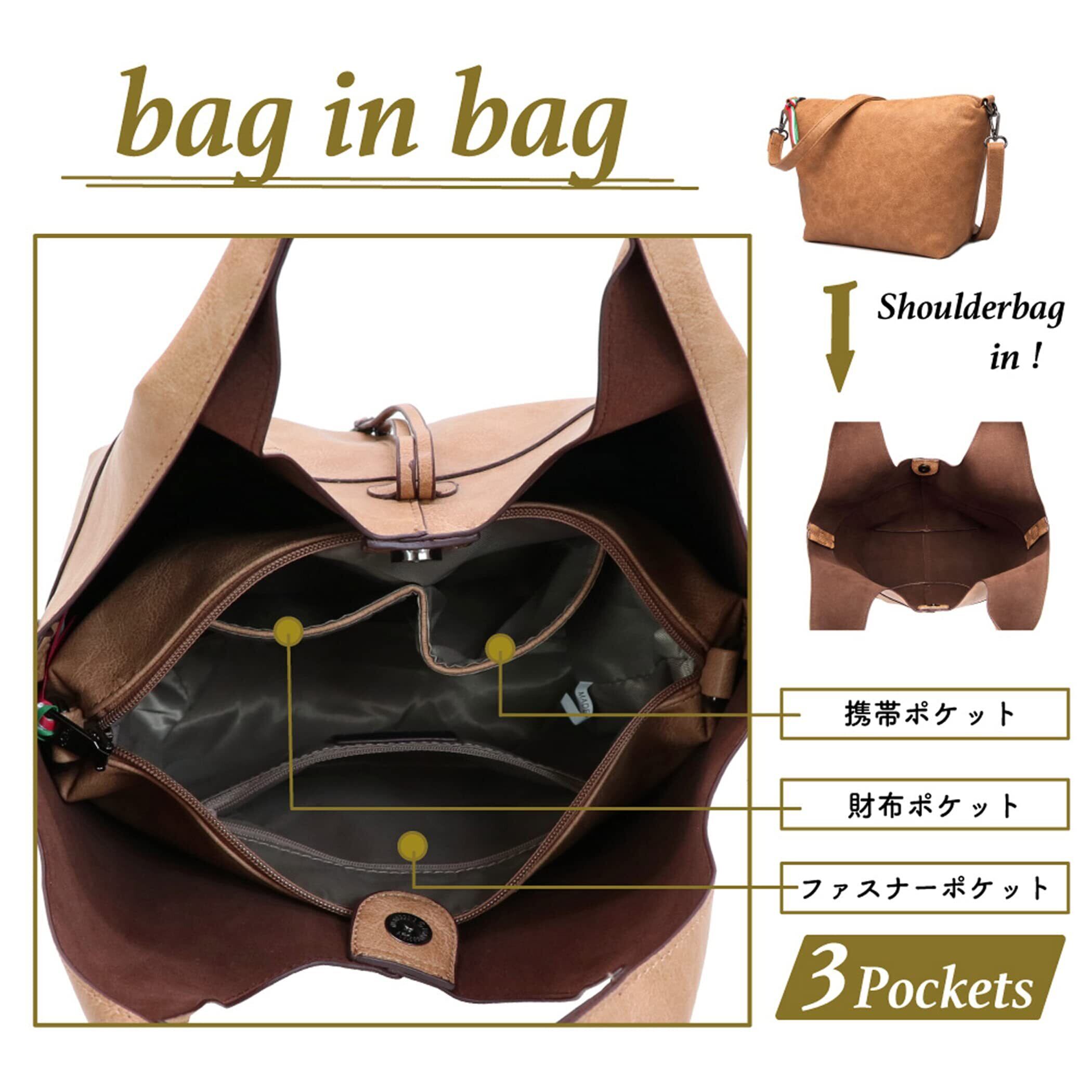スッキリデザインが大人可愛いトートバッグミニバッグがセットなのも嬉しい!①柔らかな素材で扱いやすく、毎日のお出掛けに活躍します。開口部が大きく開くから物が出し入れしやすいです。 ②モダン感漂う素材で、持っているだけでオシャレに見える優秀アイデム③バッグインバッグなので、荷物が増えた時も安心!!