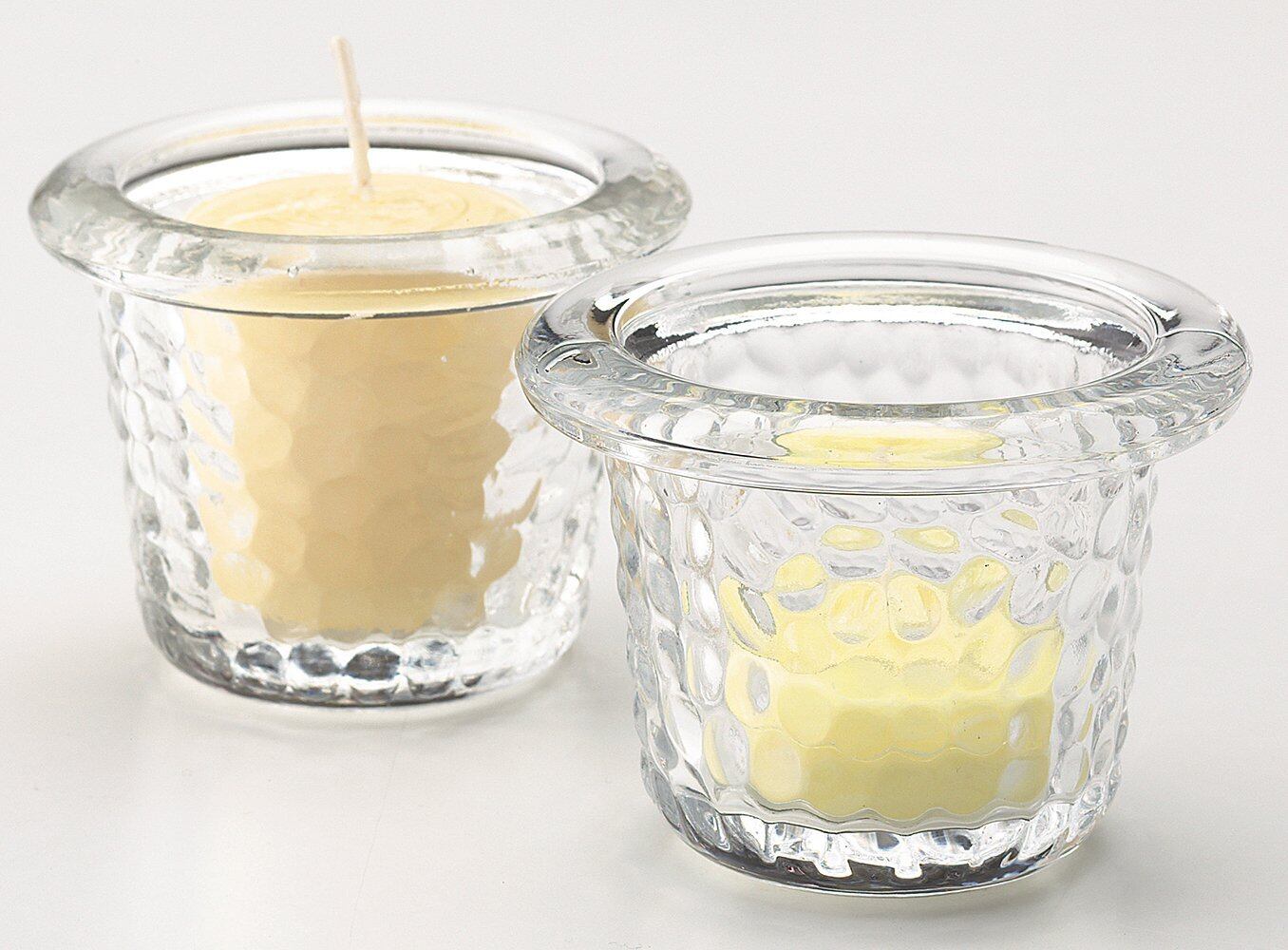 グラスを通して映るキャンドルの灯りが特徴的なガラス製キャンドルホルダー。中にセットするキャンドルはカラークリアカップティーライトやカラークリアカップボーティブがおすすめです。内寸の一番底の部分はΦ46mm