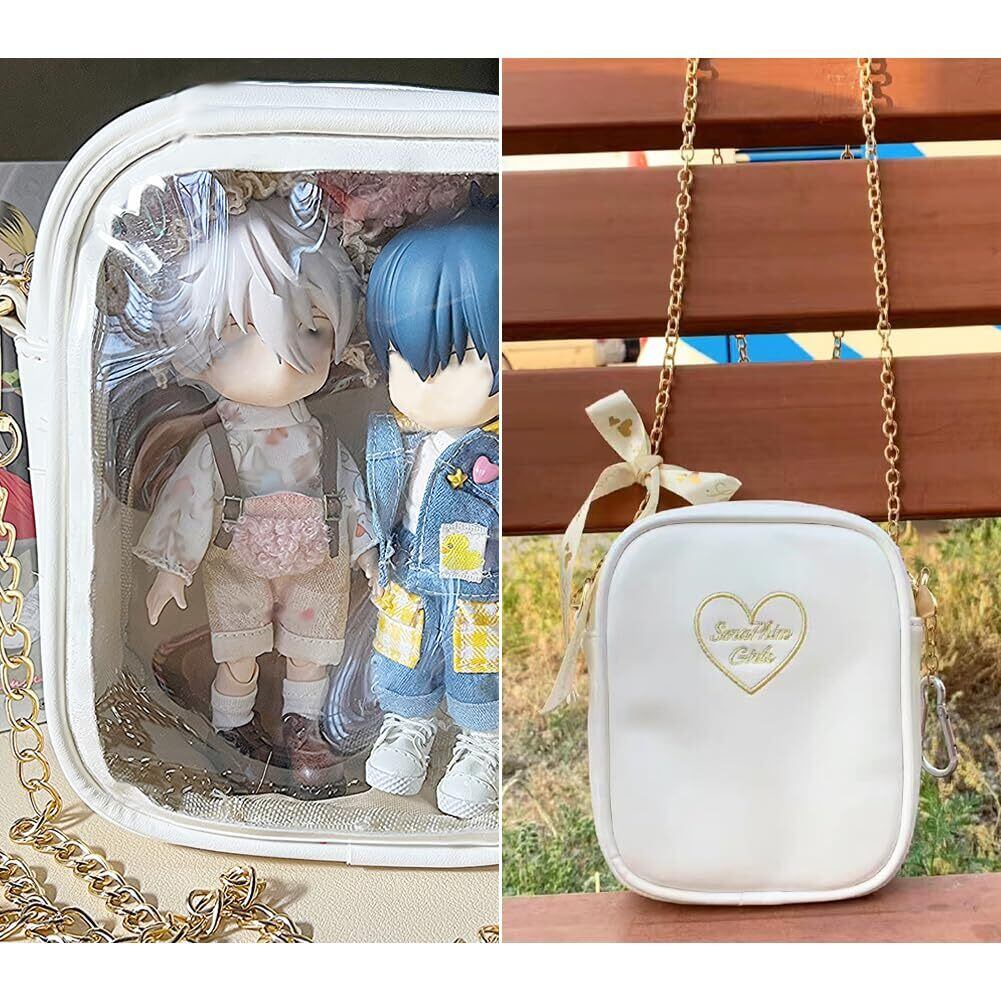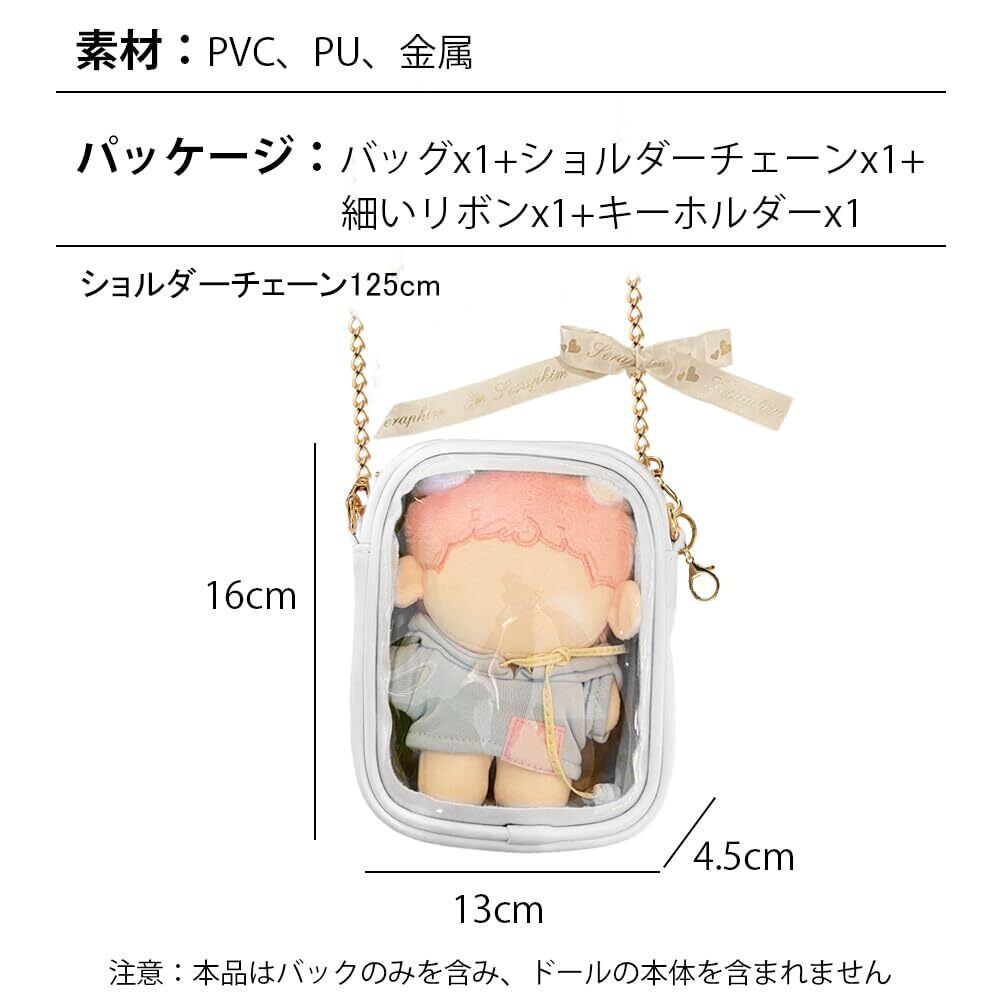 【仕様】製品名前:スクエア・片面透明ショルダー痛バッグ(人形なし)。素材:PVC、PU、金属。サイズ:13x16x4.5cm(長さx高さx幅)。パッケージは以下を含む:バッグx1+ショルダーチェーンx1+細いリボンx1+キーホルダーx1。カラー:ホワイト。