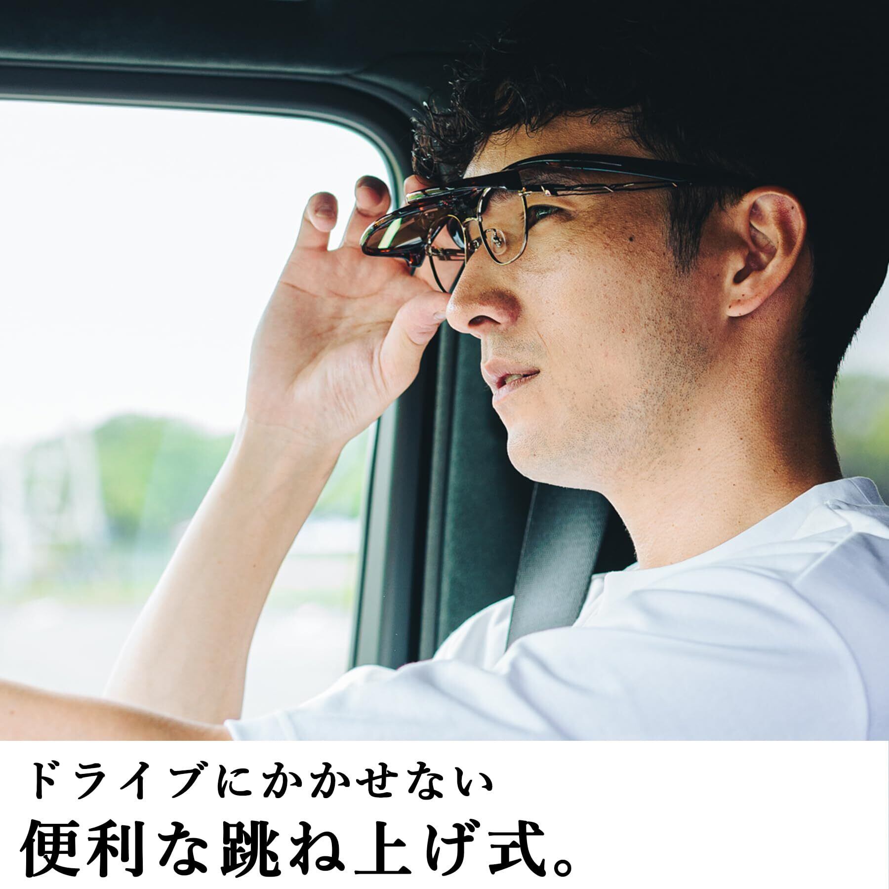 ドライブやゴルフに最適な跳ね上げ式:トンネル突入時や日差しが弱まった時など、明るさが必要な時には片手でさっとレンズを跳ね上げ可能。