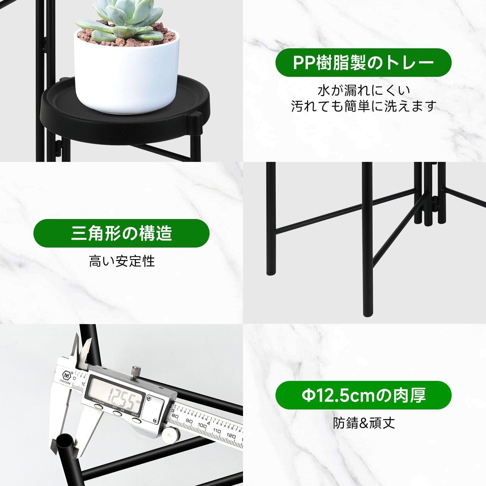 【材質】本体は鉄製で高温塗装され、丈夫で耐久性が高く、錆びや腐食を防ぎ、美観も保てます。花台はポリエステル(PP)で、軽量で耐水性、耐摩耗性に優れ、水漏れに強く、花の健康も守れます。