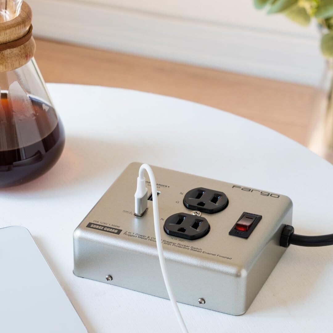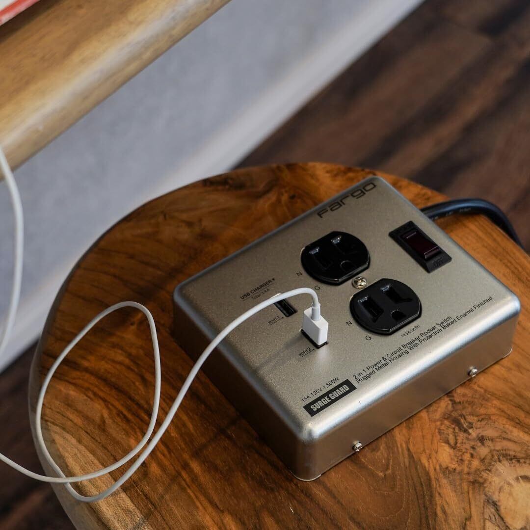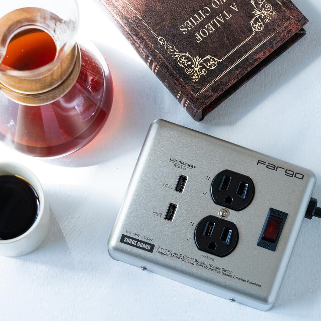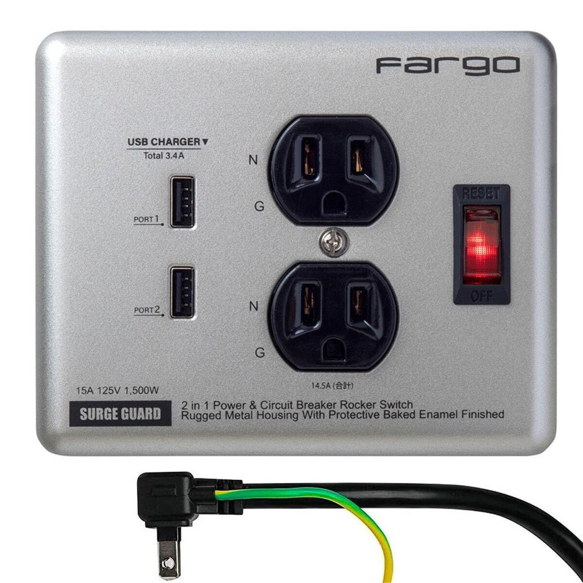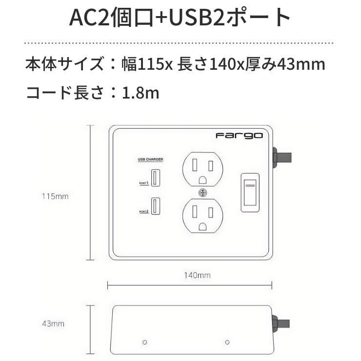 Fargo 延長コード USB 急速充電 スマホ アメリカン レトロ STEEL TAP シルバー スチールタップ ファーゴ 電源タップ 鉄製 2個口 雷サージ付 おしゃれ インテリア DIY ガレージ メタリック 一括スイッチ 1.8m