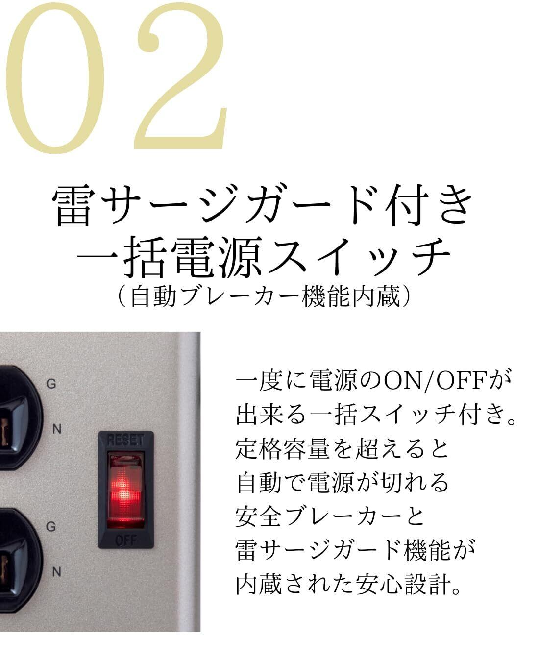 安全ブレーカー内蔵の一括スイッチ。使用電力がオーバーすると自動で電源OFF。コードの長さは使い勝手が良い1.8m。