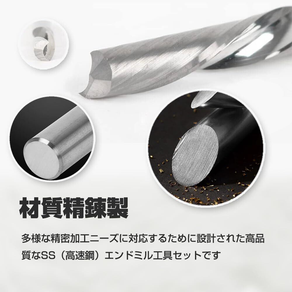 【製品概要】多様な精密加工ニーズに対応するために設計された高品質なSS(高速鋼)エンドミル工具セットです。セットには5種類の寸法のフライスが含まれており、直径はそれぞれ1.5 mm、2 mm、2.5 mm、3 mm、4 mm、5 mm、6 mmで、それぞれ1本、柄径は6 mmに統一されており、NC(デジタル制御)機、高速機械彫刻などの設備に広く応用するのに適している。