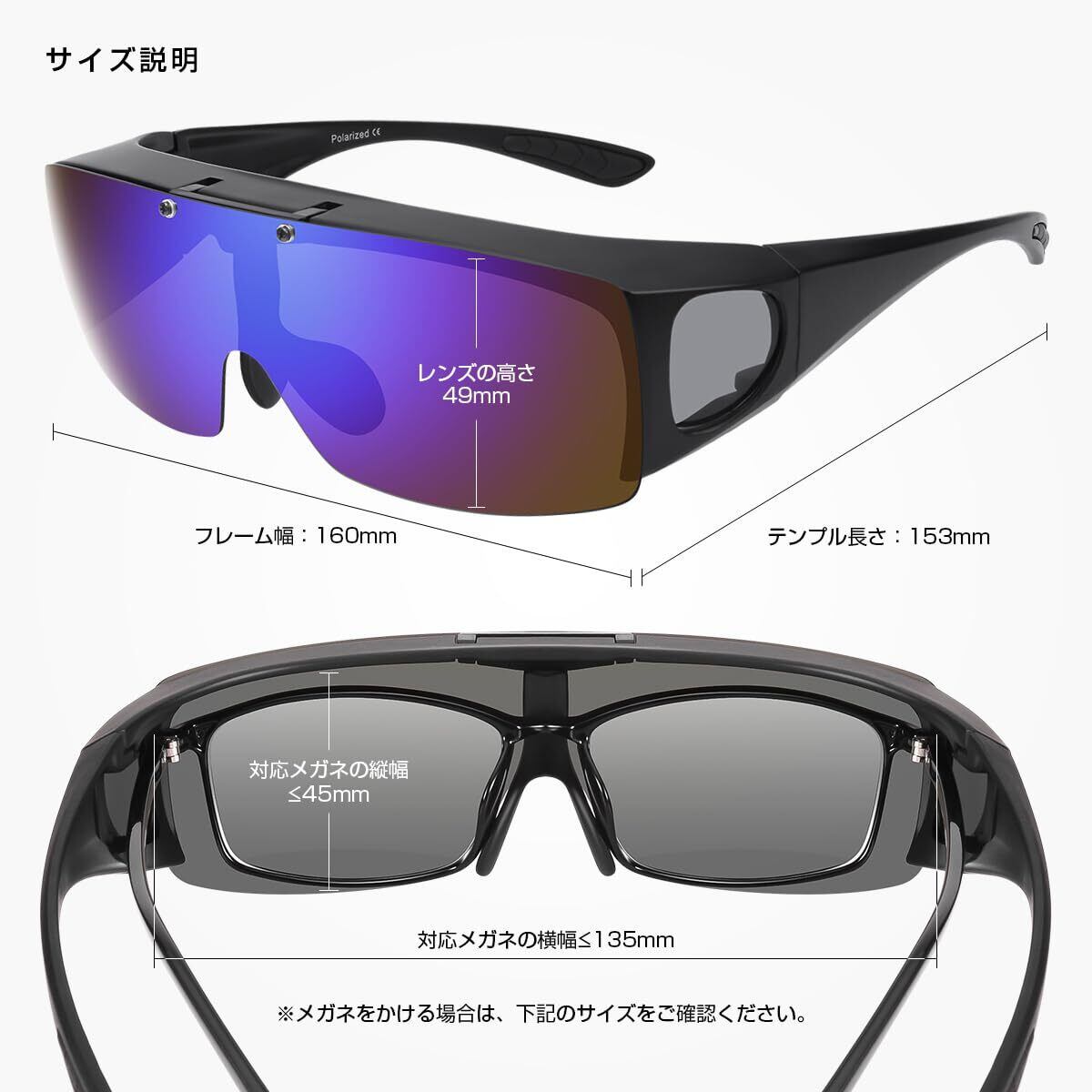 普通のサングラスとは違い、メガネを掛けたまま装着できる特殊なサングラス!使用可能なメガネサイズは約135x45mmです。
