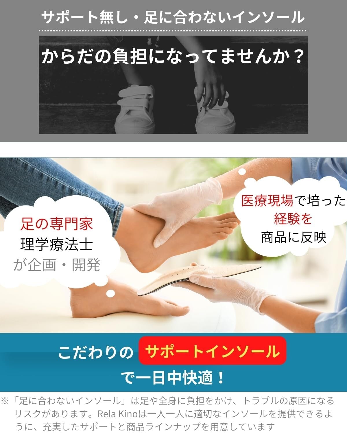 Rela Kino インソール [1日中快適] 理学療法士監修 中敷き 衝撃吸収 アーチサポート 男女兼用 (21.5-23.5cm, 黒)