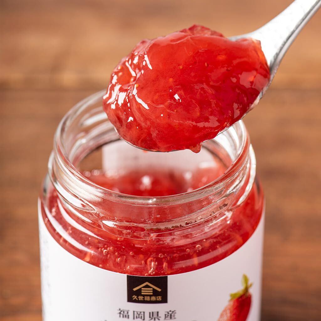 『赤い・丸い・大きい・うまい』の頭文字から名付けられた「あまおう」。名前の由来通り、一般的に果実が大きく赤くツヤがあり、酸味は少なく糖度が高いのが特徴です。福岡県産あまおうだけを使った、濃厚な味わいのあるジャムです。