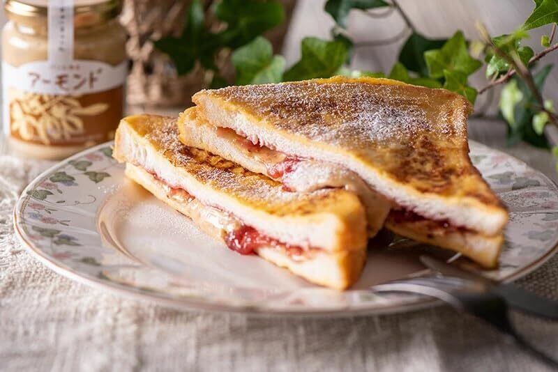 食パンにアーモンドペーストといちごジャムをぬってサンドしてフレンチトーストにします。 あつあつのとろけるおいしさがたまりません。