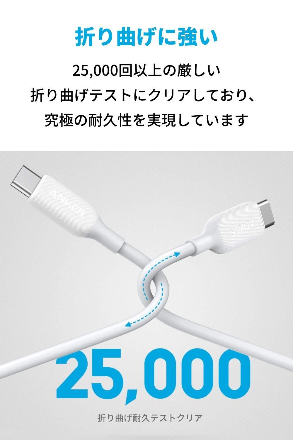 折り曲げに強い:25,000回以上の厳しい折り曲げテストにクリアしており、究極の耐久性を実現しました。また、Anker PowerLine III USB-C & USB-C 2.0 ケーブルは、PowerLineシリーズが持つ高耐久性を残しつつ、シリーズ史上最も細い構造に仕上げました。