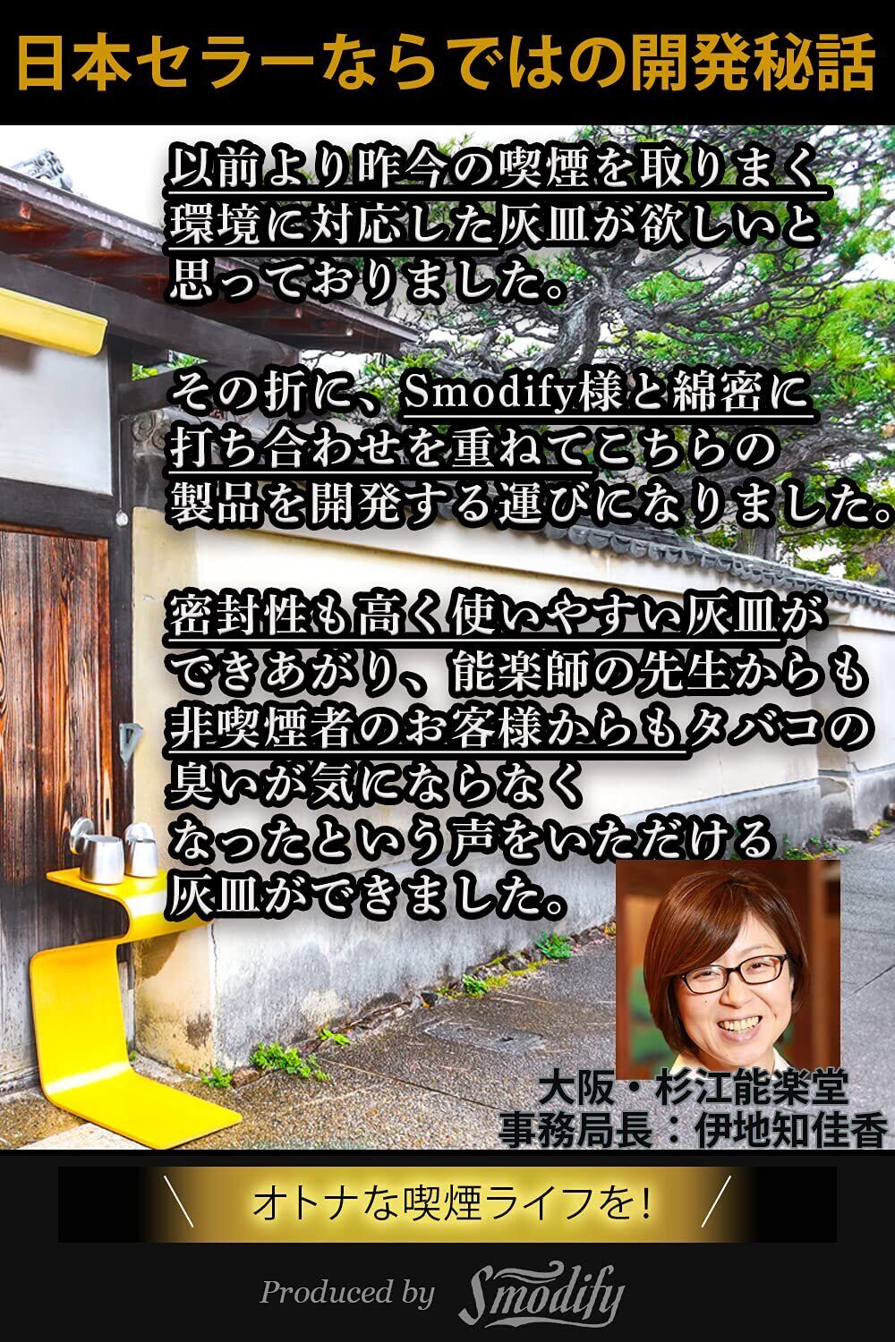 【愛煙家がこだわった蓋】高品質のステンレス素材を採用し、堅牢で密封性の高いフタで煙が漏れにくくなりました。また蓋と本体とのスキマをさらに縮めたことで、蓋の開閉時に生じる音も鳴りずらくなりました。ベランダでの喫煙でも防臭効果とあわせて近所の方を気にすることなく楽しめます。さらに蓋を自由に本体部分にかけていただくことが可能なので、外用として防風効果も期待できます。